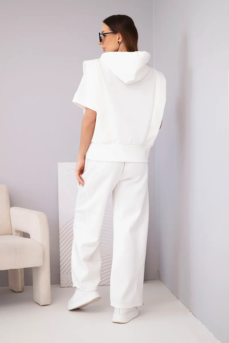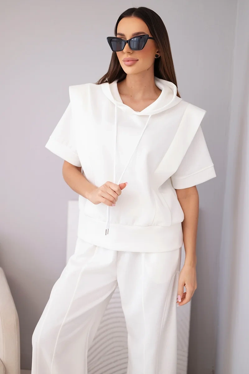 Komplet damski masełkowy bluza z kapturem i luźne spodnie z wiązaniem ecru Stylowy i wygodny komplet damski to doskonała propozycja dla kobiet ceniących komfort oraz modny, sportowy look. Zestaw składa się z bluzy damskiej z krótkim rękawem i praktycznym kapturem oraz spodni z szeroką nogawką i elastycznym pasem. Całość tworzy spójny, nowoczesny komplet idealny na co dzień, spacer, zakupy czy spotkanie z przyjaciółmi. Produkcja Włoska gwarantuje wysoką jakość wykonania oraz dbałość o detale.