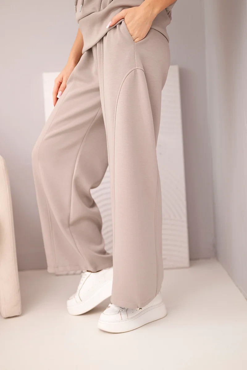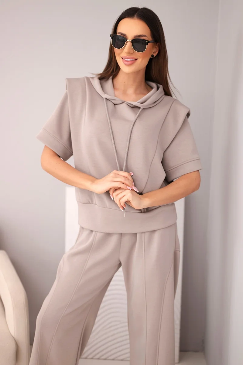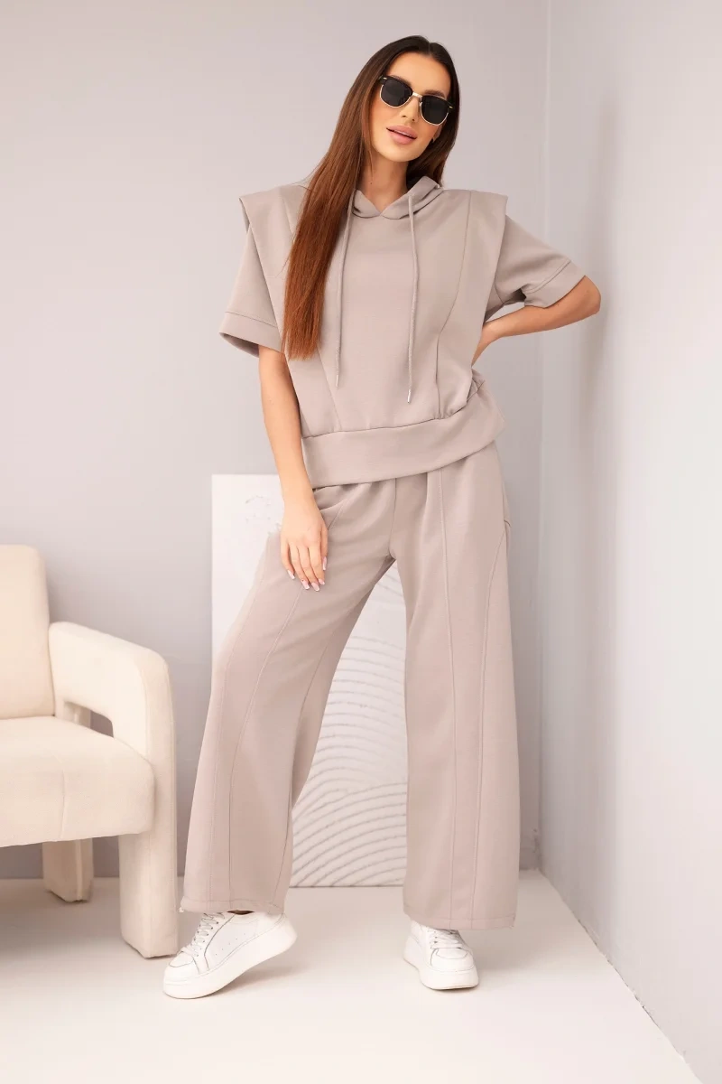 Bluza damska posiada luźniejszy fason, który zapewnia swobodę ruchów i wygodę noszenia. Kaptur z regulowanymi troczkami nadaje jej sportowego charakteru, a krótki rękaw sprawia, że komplet świetnie sprawdzi się w cieplejsze dni lub jako element stylizacji warstwowej. Spodnie z szeroką nogawką pięknie układają się na sylwetce, optycznie ją wydłużając. Elastyczny pas z wiązaniem pozwala na idealne dopasowanie do figury.
