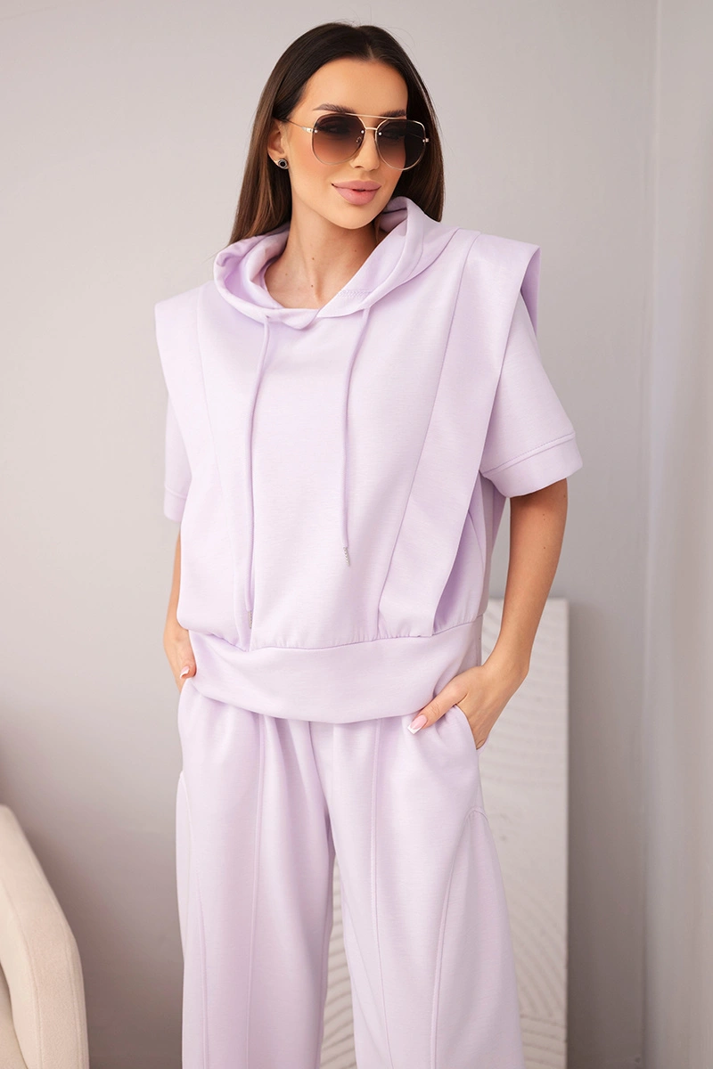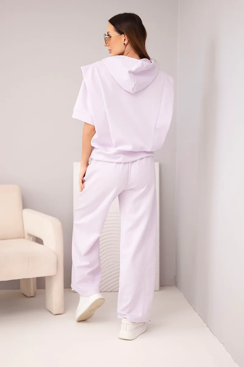 Komplet damski masełkowy bluza z kapturem i luźne spodnie z wiązaniem jasny fioletowy Stylowy i wygodny komplet damski to doskonała propozycja dla kobiet ceniących komfort oraz modny, sportowy look. Zestaw składa się z bluzy damskiej z krótkim rękawem i praktycznym kapturem oraz spodni z szeroką nogawką i elastycznym pasem. Całość tworzy spójny, nowoczesny komplet idealny na co dzień, spacer, zakupy czy spotkanie z przyjaciółmi. Produkcja Włoska gwarantuje wysoką jakość wykonania oraz dbałość o detale.
