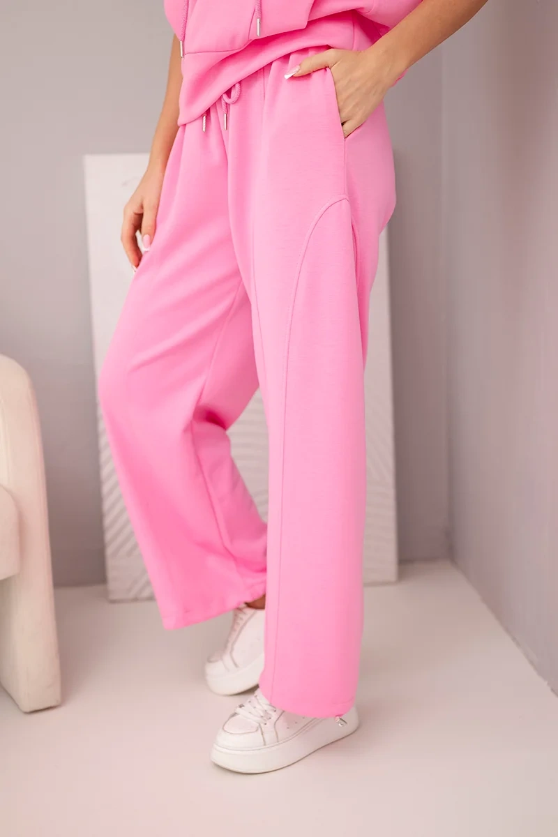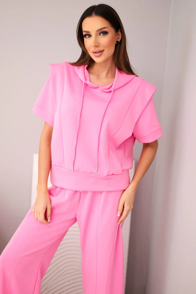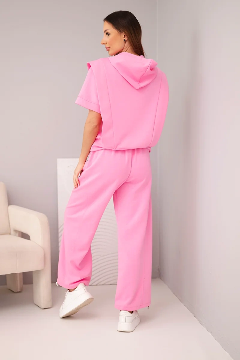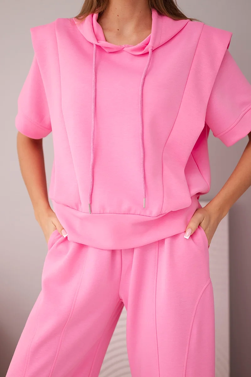 Komplet damski masełkowy bluza z kapturem i luźne spodnie z wiązaniem jasny różowy Stylowy i wygodny komplet damski to doskonała propozycja dla kobiet ceniących komfort oraz modny, sportowy look. Zestaw składa się z bluzy damskiej z krótkim rękawem i praktycznym kapturem oraz spodni z szeroką nogawką i elastycznym pasem. Całość tworzy spójny, nowoczesny komplet idealny na co dzień, spacer, zakupy czy spotkanie z przyjaciółmi. Produkcja Włoska gwarantuje wysoką jakość wykonania oraz dbałość o detale.