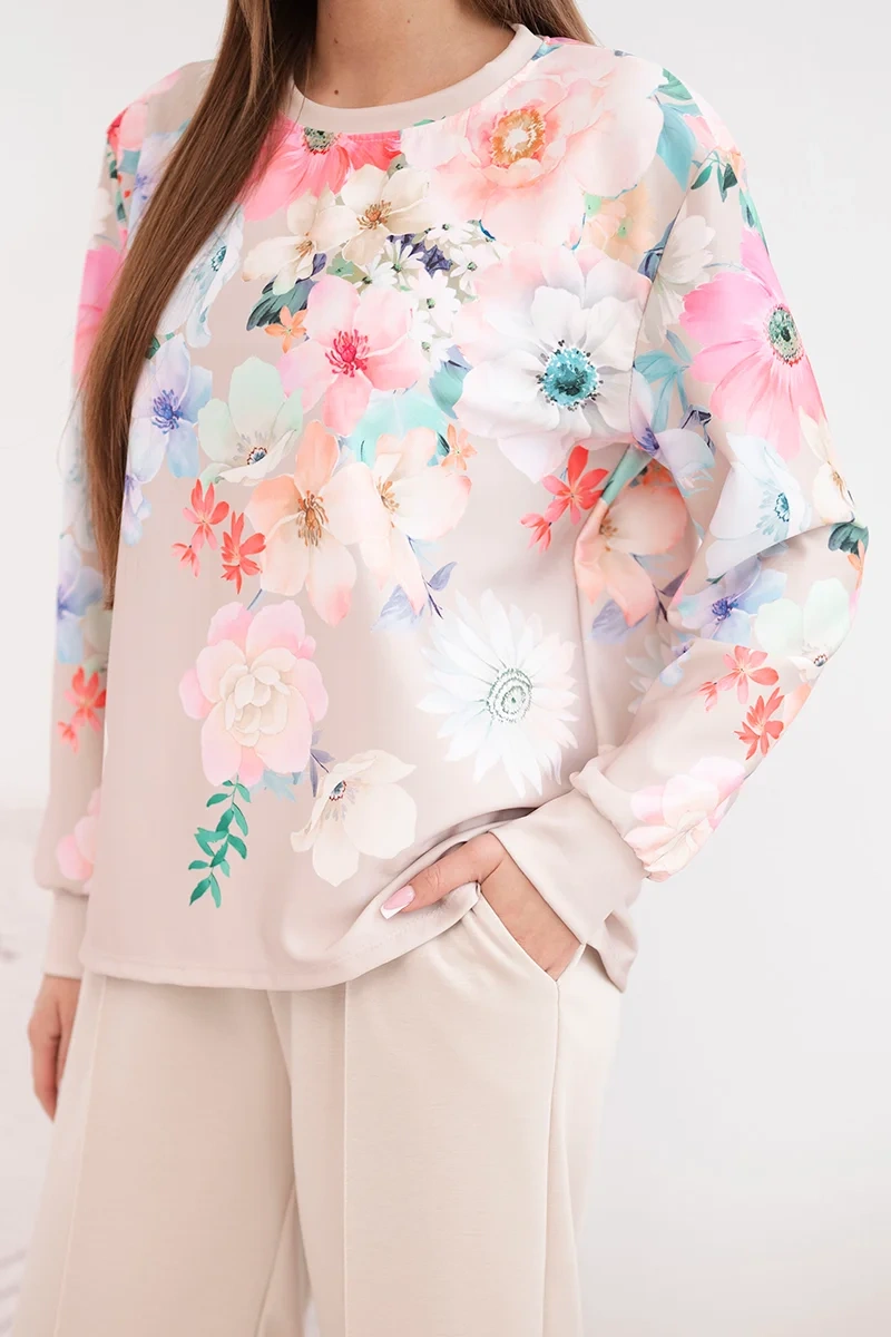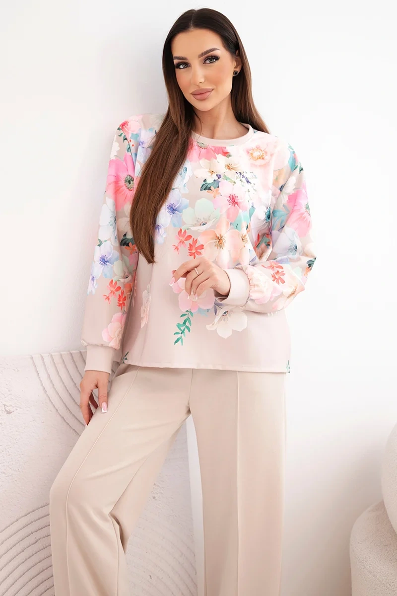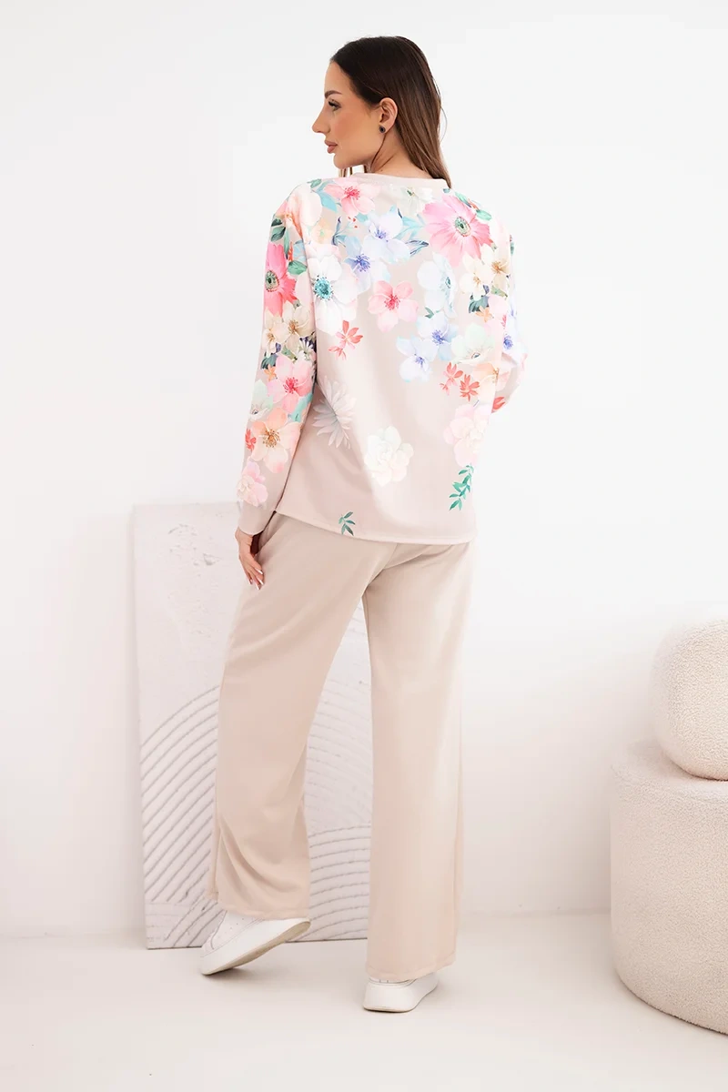 Komplet damski masełkowy wiskozowy w kwiaty z szeroką nogawką beżowy Elegancki komplet damski masełkowy wiskozowy to doskonała propozycja dla kobiet, które cenią wygodę połączoną z kobiecym stylem. Góra zestawu wyróżnia się efektownym, kwiatowym wzorem, który nadaje całości świeżości i subtelnej elegancji. Spodnie w jednolitym kolorze doskonale równoważą stylizację, tworząc harmonijny i modny zestaw.