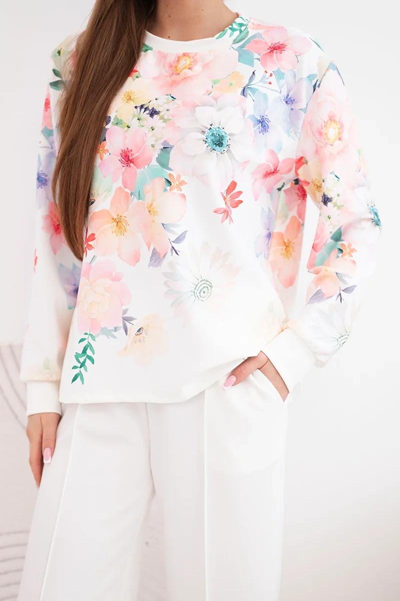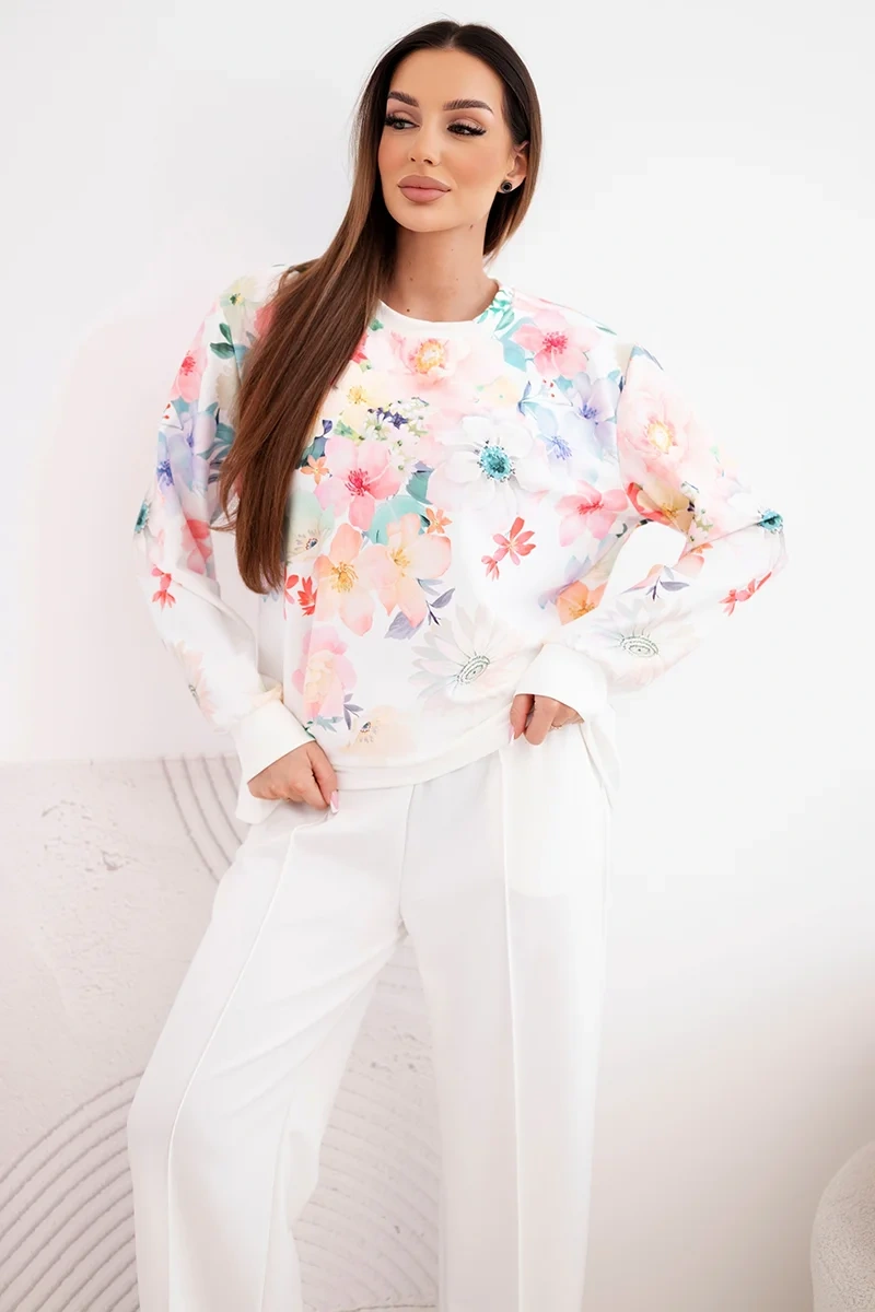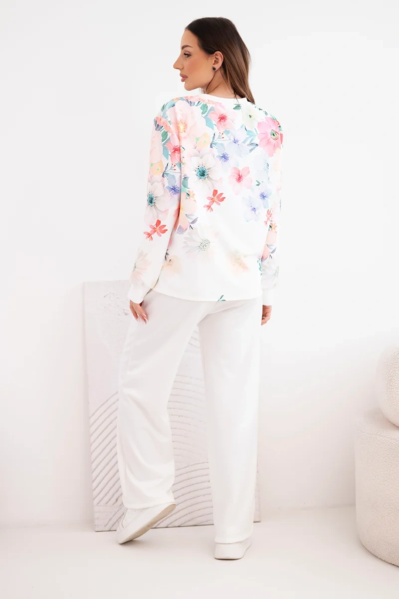 Komplet damski masełkowy wiskozowy w kwiaty z szeroką nogawką biały Elegancki komplet damski masełkowy wiskozowy to doskonała propozycja dla kobiet, które cenią wygodę połączoną z kobiecym stylem. Góra zestawu wyróżnia się efektownym, kwiatowym wzorem, który nadaje całości świeżości i subtelnej elegancji. Spodnie w jednolitym kolorze doskonale równoważą stylizację, tworząc harmonijny i modny zestaw.