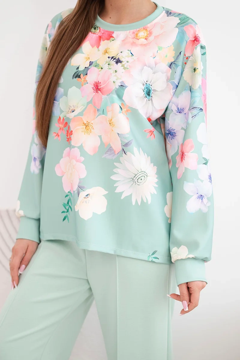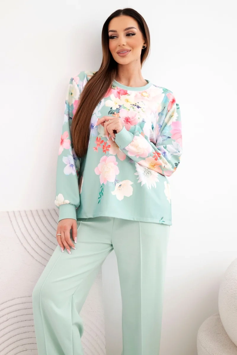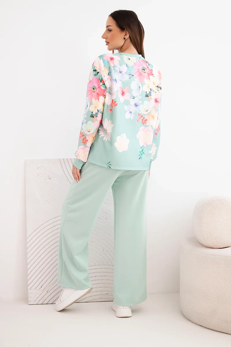 Komplet damski masełkowy wiskozowy w kwiaty z szeroką nogawką ciemno miętowy Elegancki komplet damski masełkowy wiskozowy to doskonała propozycja dla kobiet, które cenią wygodę połączoną z kobiecym stylem. Góra zestawu wyróżnia się efektownym, kwiatowym wzorem, który nadaje całości świeżości i subtelnej elegancji. Spodnie w jednolitym kolorze doskonale równoważą stylizację, tworząc harmonijny i modny zestaw.