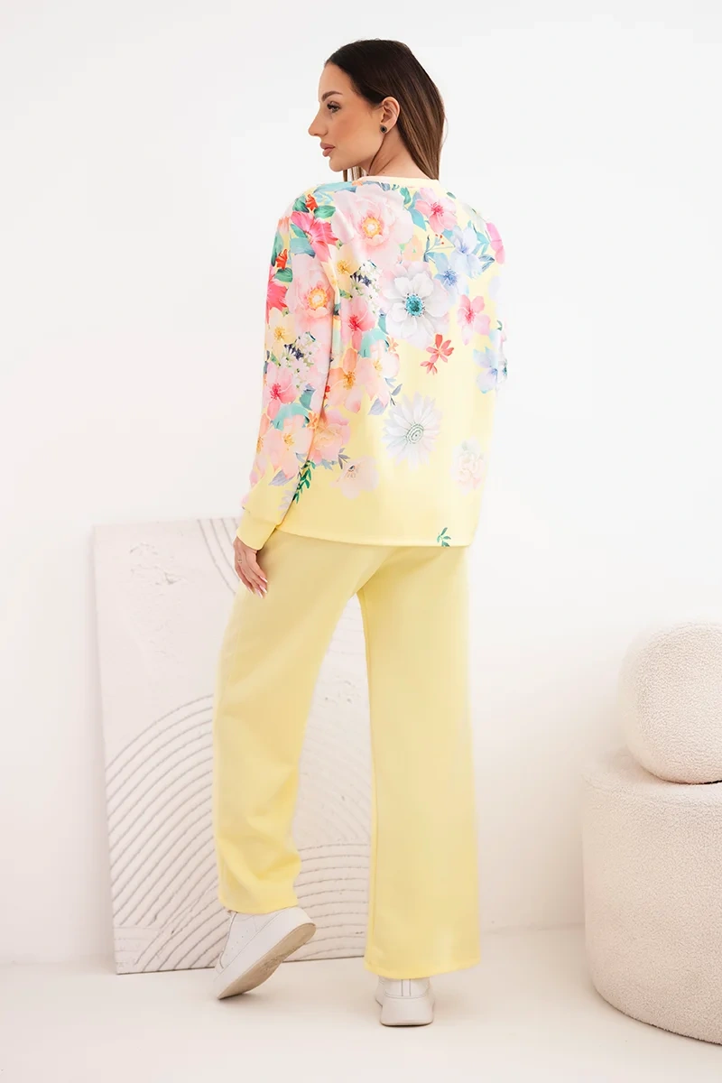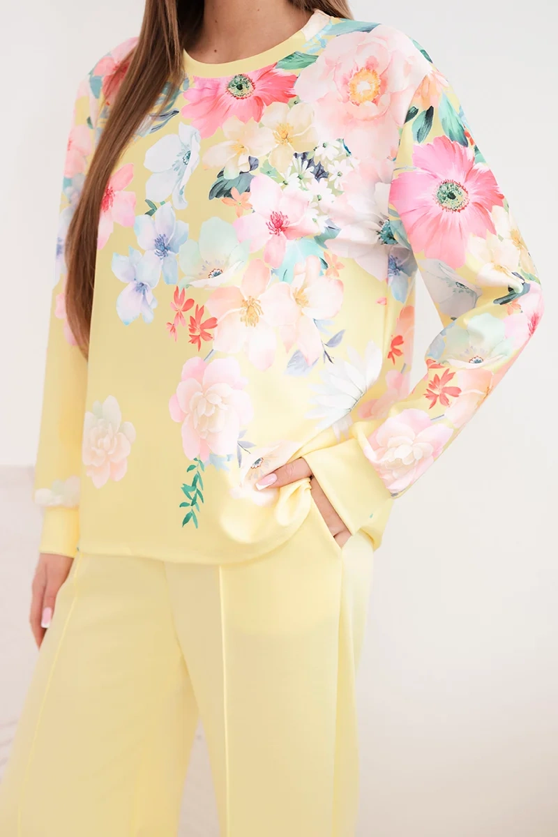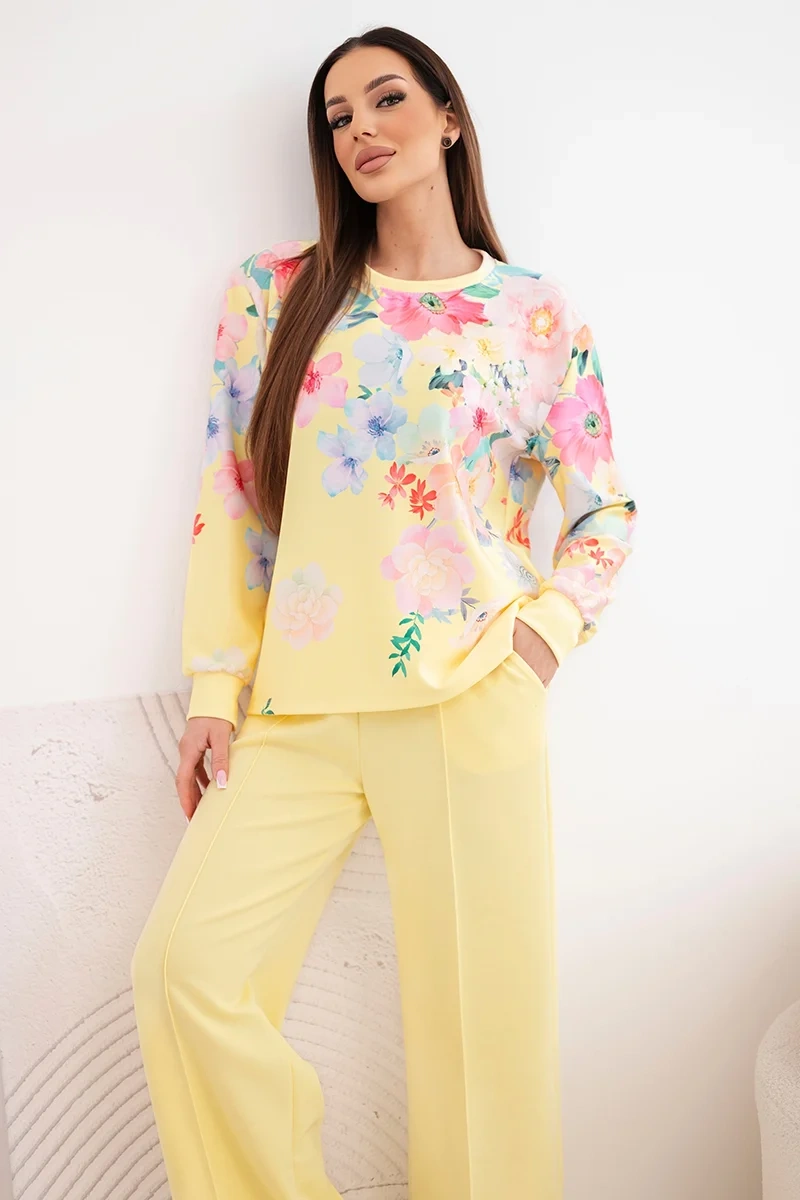 Komplet damski masełkowy wiskozowy w kwiaty z szeroką nogawką żółty Elegancki komplet damski masełkowy wiskozowy to doskonała propozycja dla kobiet, które cenią wygodę połączoną z kobiecym stylem. Góra zestawu wyróżnia się efektownym, kwiatowym wzorem, który nadaje całości świeżości i subtelnej elegancji. Spodnie w jednolitym kolorze doskonale równoważą stylizację, tworząc harmonijny i modny zestaw.