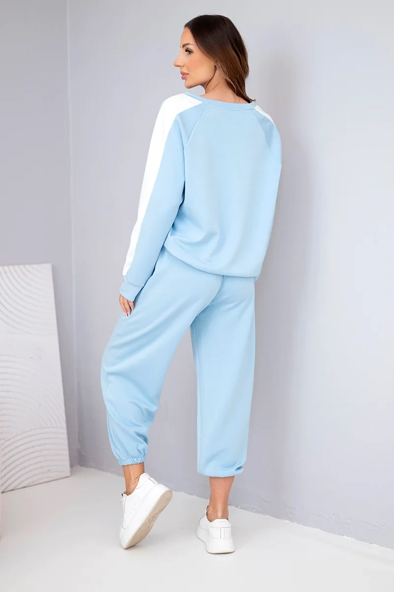 Komplet damski masełkowy z lampasem i ściągaczem niebieski Stylowy komplet damski masełkowy to idealna propozycja dla kobiet ceniących wygodę i modny, sportowy styl. Zestaw składa się z luźnej bluzy oraz komfortowych spodni ze ściągaczem, tworząc spójną i nowoczesną stylizację na co dzień.