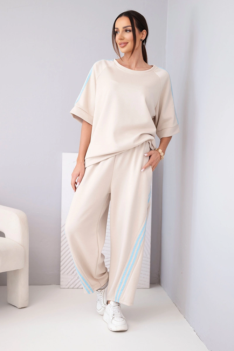 Bluza o swobodnym kroju posiada rękawy z ozdobnymi lampasami, które nadają całości nowoczesnego charakteru. Spodnie z elastyczną talią i bocznymi lampasami optycznie wysmuklają nogi. Komplet świetnie sprawdzi się na co dzień, na spacer, zakupy czy w podróży.