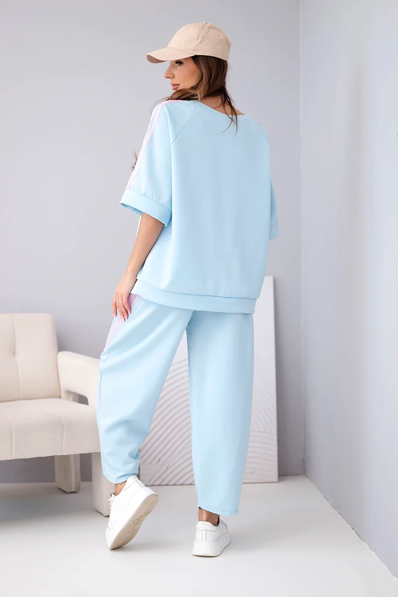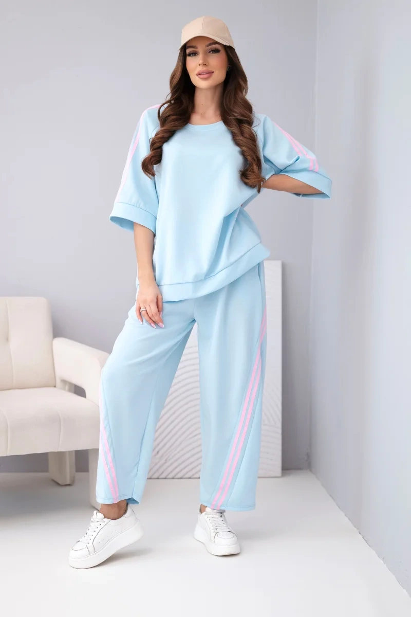 Bluza o swobodnym kroju posiada rękawy z ozdobnymi lampasami, które nadają całości nowoczesnego charakteru. Spodnie z elastyczną talią i bocznymi lampasami optycznie wysmuklają nogi. Komplet świetnie sprawdzi się na co dzień, na spacer, zakupy czy w podróży.