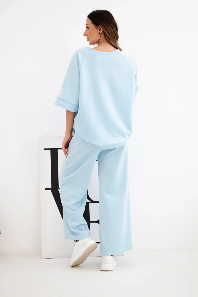 Wykonany z wysokiej jakości wiskozy z dodatkiem elastanu komplet jest niezwykle miękki, delikatny dla skóry i przyjemny w noszeniu. Bluza o swobodnym kroju świetnie układa się na sylwetce, a spodnie z szeroką nogawką nadają stylizacji nowoczesnego charakteru. Idealny wybór na co dzień, do pracy w luźniejszym wydaniu, na spacer czy podróż.
