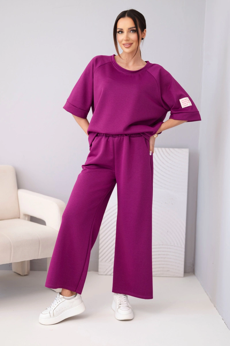 Komplet damski masełkowy z wiskozy bluza i szerokie spodnie śliwkowy
