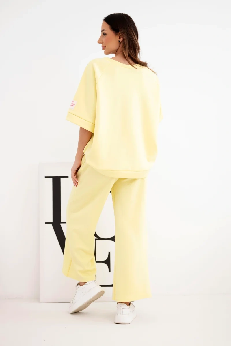 Komplet damski masełkowy z wiskozy bluza i szerokie spodnie żółty Stylowy komplet damski masełkowy to doskonała propozycja dla kobiet ceniących wygodę i modny, minimalistyczny styl. Zestaw składa się z luźnej bluzy oraz szerokich spodni z elastycznym pasem, które zapewniają pełną swobodę ruchów i komfort przez cały dzień.