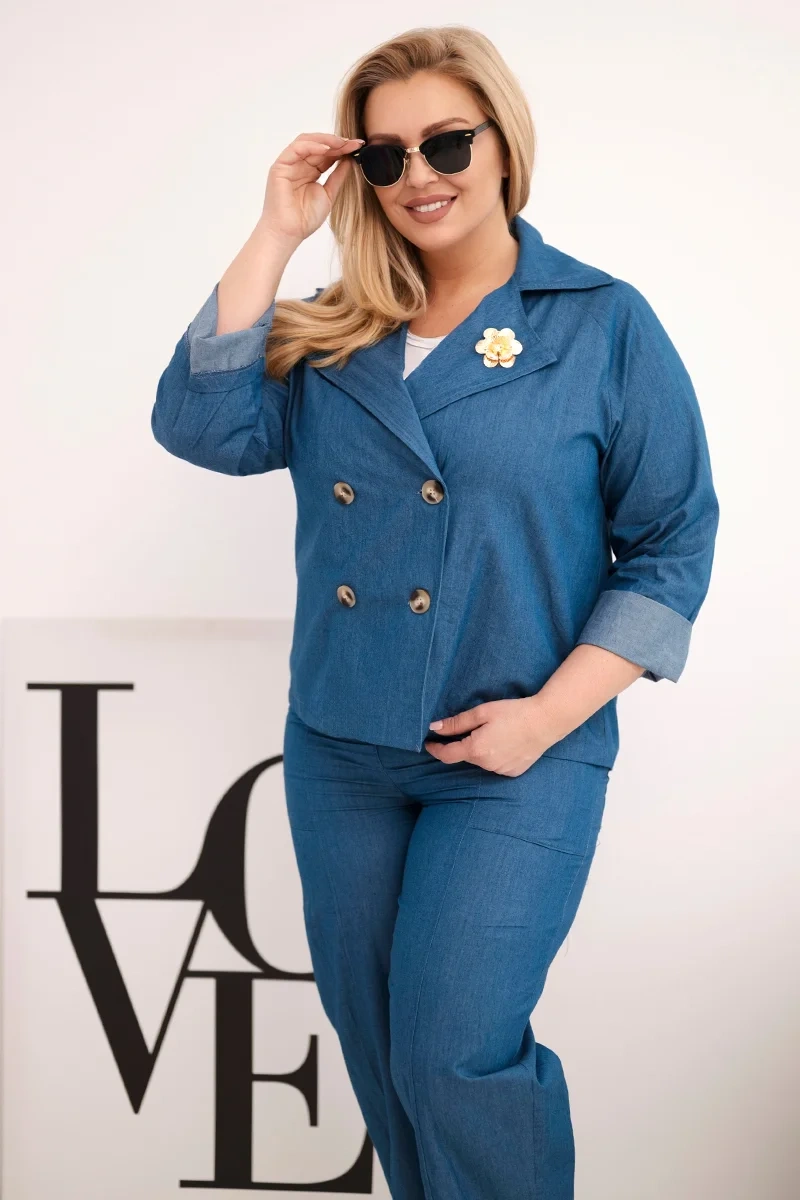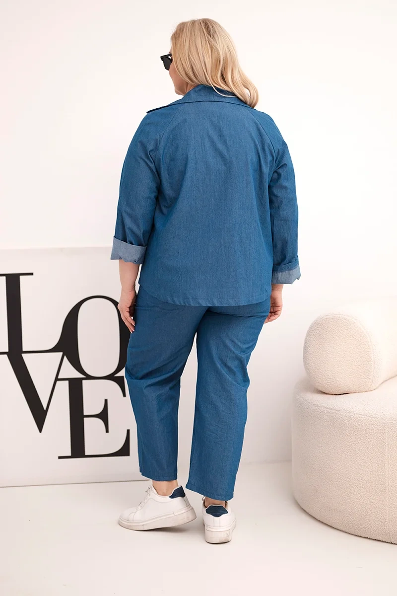Komplet damski Plus Size bawełniany z marynarką i spodniami ciemno jeansowy Ten komplet damski to idealne połączenie wygody i elegancji w stylu casual. Składa się z lekkiej, bawełnianej marynarki z kołnierzem i podwijanymi rękawami oraz komfortowych spodni z elastycznym pasem i szerokimi nogawkami. Całość prezentuje się stylowo i nowocześnie – doskonała propozycja na wiosnę i lato. Komplet świetnie sprawdzi się zarówno na co dzień, jak i do pracy czy spotkanie ze znajomymi. Naturalny materiał gwarantuje przewiewność i komfort noszenia nawet w cieplejsze dni.