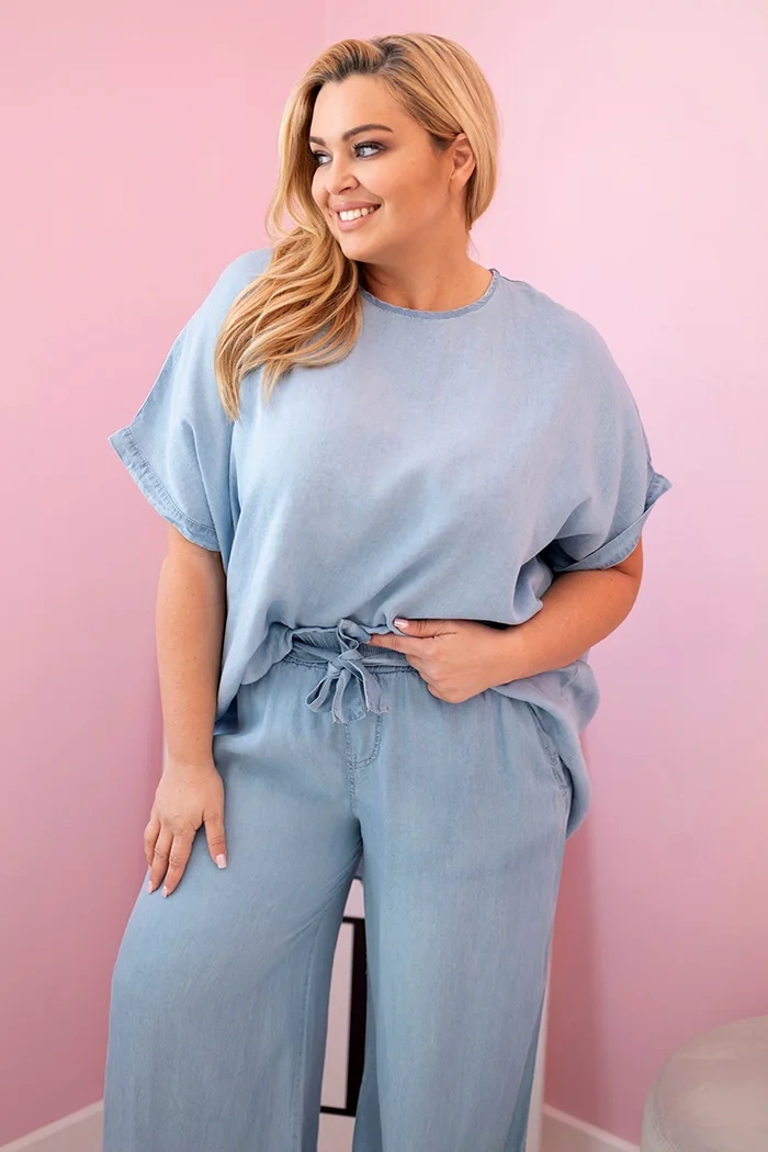 Komplet damski Plus Size z tencelu bluzka i spodnie z wiązaniem jasno jeansowy Stylowy i wygodny komplet damski Plus Size wykonany z naturalnego tencelu to idealna propozycja na lato i codzienne stylizacje. Zestaw składa się z luźnej bluzki o asymetrycznym kroju oraz spodni z szerokimi nogawkami i dekoracyjnym wiązaniem w pasie. Tkanina tencel jest miękka, przewiewna i przyjemna dla skóry – zapewnia komfort nawet w najcieplejsze dni. Luźny fason oraz elastyczna talia sprawiają, że komplet świetnie układa się na sylwetce Plus Size, podkreślając atuty figury i tuszując niedoskonałości. Świetny wybór na co dzień, na wakacje, do pracy lub na luźne spotkania z przyjaciółmi. Model dedykowany Paniom noszącym rozmiary Plus Size – XXL, XXXL i większe.