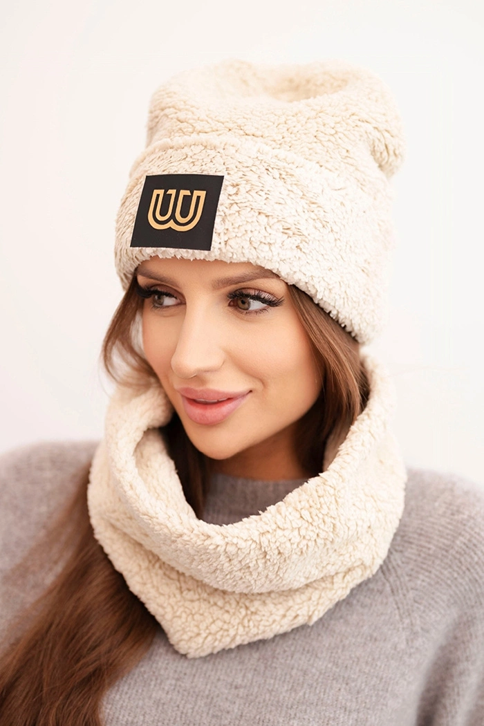 Komplet damski polarowy czapka i komin z ozdobną naszywką beżowy Stylowy i bardzo ciepły komplet damski polarowy, który składa się z czapki oraz pasującego komina. Wykonany z miękkiego, przytulnego polaru – idealnego na chłodne dni. Czapka posiada ozdobną naszywkę z przodu, a komin zakładany przez głowę chroni szyję przed zimnem.