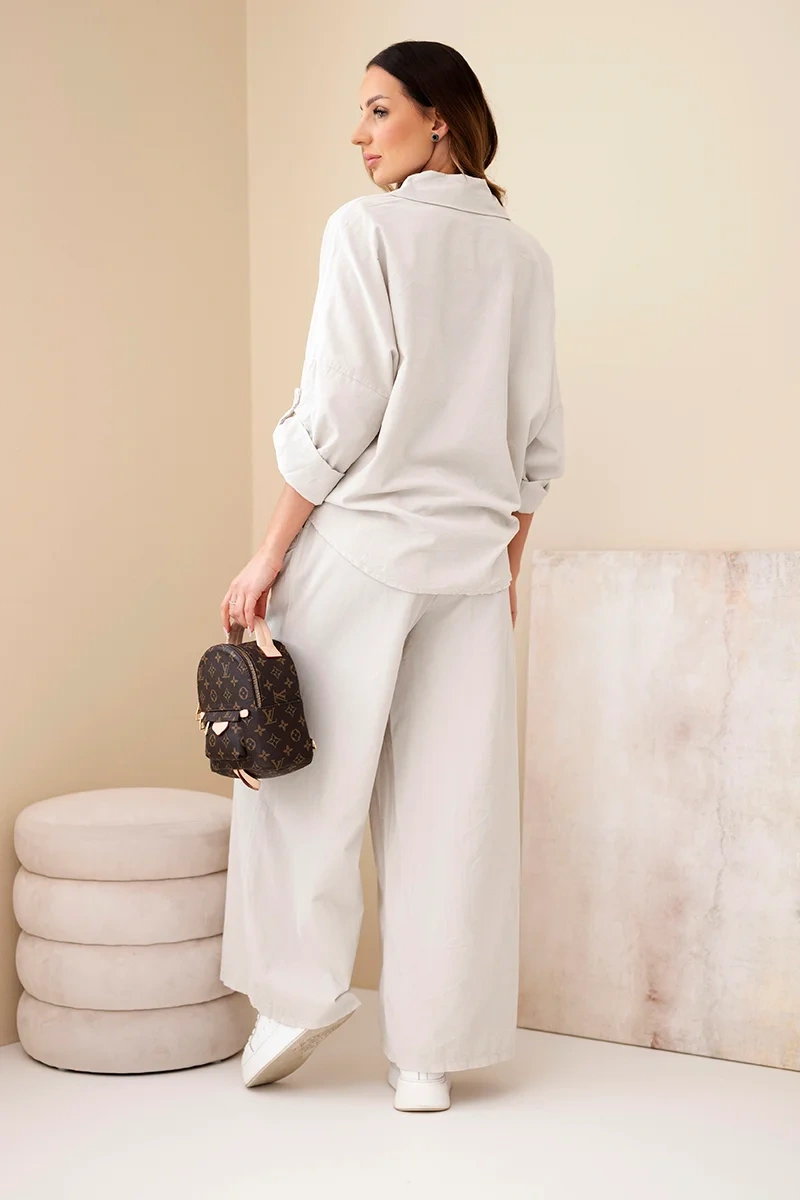 Stylowy komplet damski bawełniany to doskonała propozycja dla kobiet ceniących naturalne tkaniny i swobodny, modny wygląd. Zestaw składa się z koszuli o luźnym kroju oraz spodni z szeroką nogawką, tworząc wygodną i kobiecą stylizację na wiele okazji.