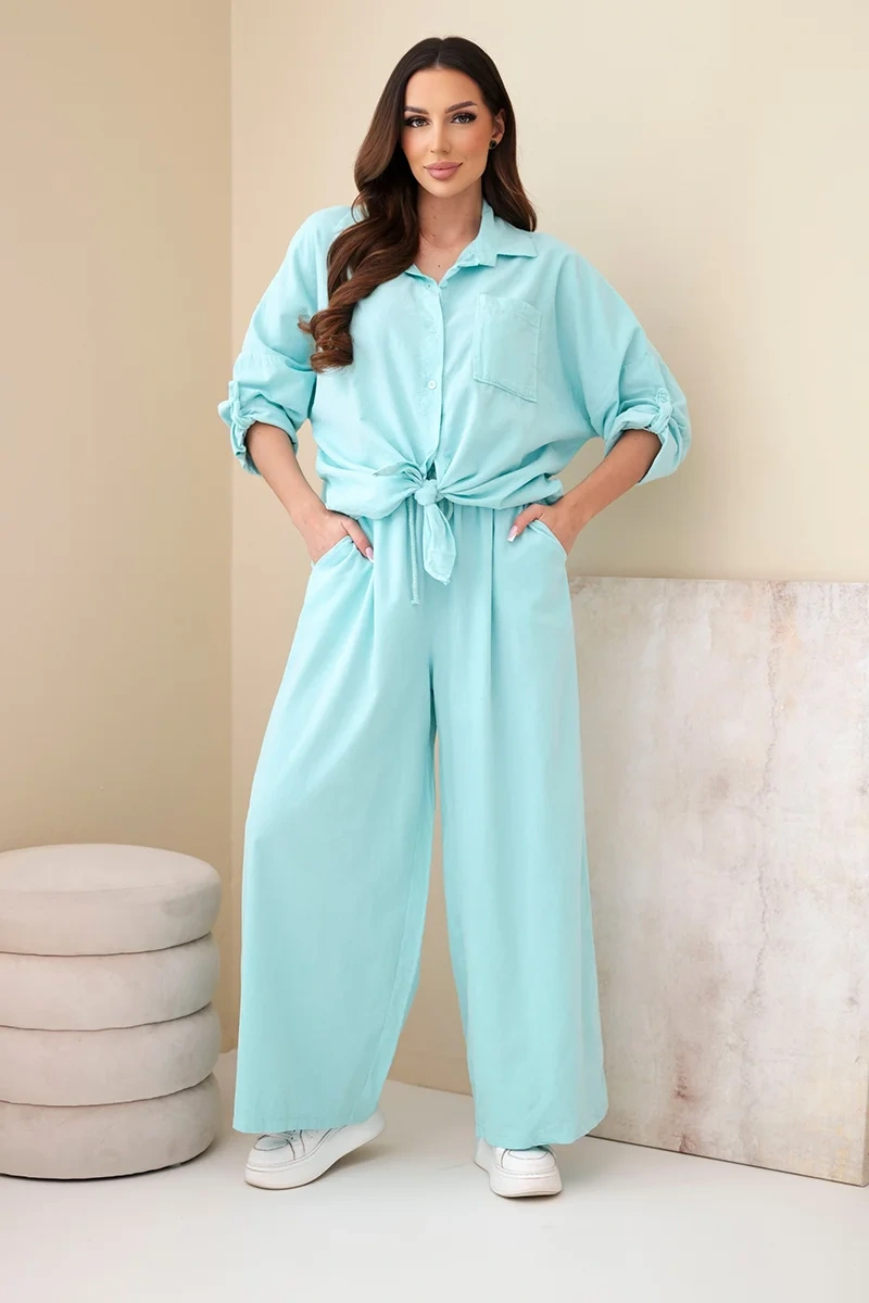 Koszula zapinana na guziki posiada klasyczny kołnierzyk oraz praktyczną kieszonkę na piersi. Dodatkowym atutem jest możliwość wiązania z przodu, co nadaje całości lekkości i podkreśla sylwetkę. Rękawy o długości 3/4 można swobodnie podwinąć, uzyskując jeszcze bardziej casualowy efekt. Spodnie z elastyczną gumką i troczkiem w pasie gwarantują komfort noszenia, a szeroka nogawka pięknie układa się podczas ruchu.