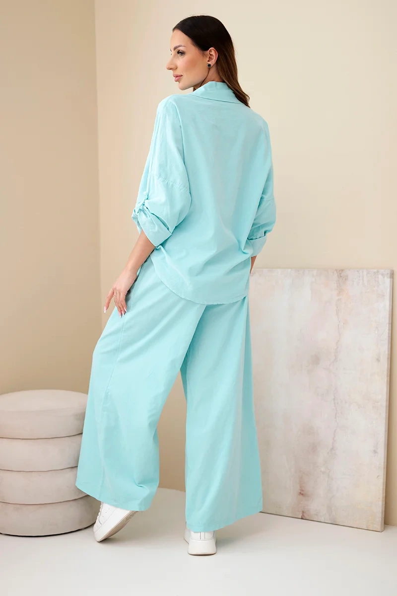 Stylowy komplet damski bawełniany to doskonała propozycja dla kobiet ceniących naturalne tkaniny i swobodny, modny wygląd. Zestaw składa się z koszuli o luźnym kroju oraz spodni z szeroką nogawką, tworząc wygodną i kobiecą stylizację na wiele okazji.