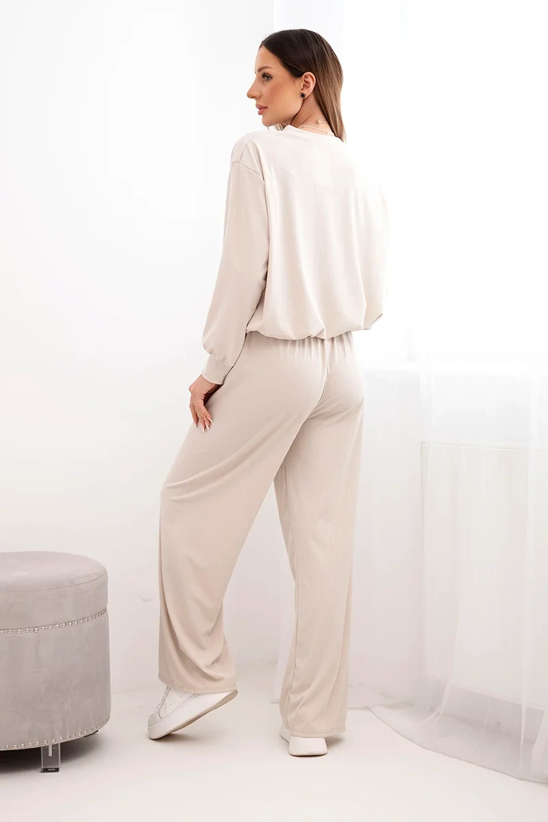 Komplet damski wiskozowy bluza z wisiorkiem i szerokie spodnie beżowy Stylowy i wygodny komplet damski stworzony z myślą o kobiecie, która ceni sobie modę i komfort. Luźna bluza z długim rękawem, zakończona elastycznym ściągaczem, subtelnie podkreśla talię, a jednocześnie zapewnia swobodę ruchów. Szerokie spodnie z elastyczną talią i prostą nogawką tworzą harmonijną całość, która świetnie sprawdzi się na co dzień, w podróży, a nawet jako elegancki homewear. Przyjemna w dotyku wiskoza z dodatkiem elastanu daje uczucie miękkości i dopasowania.