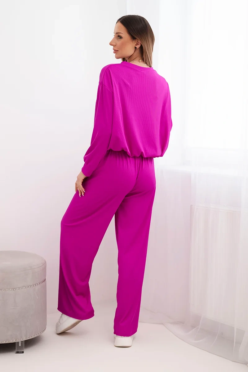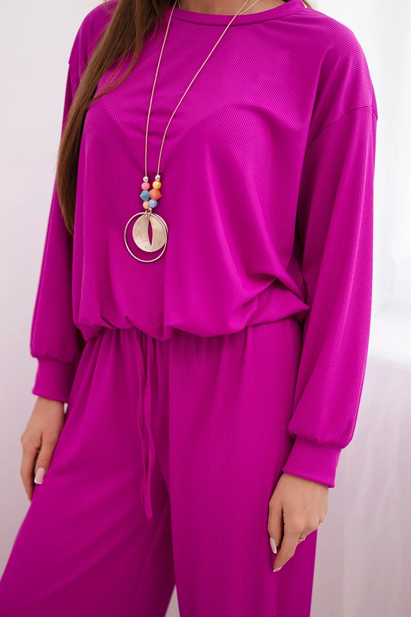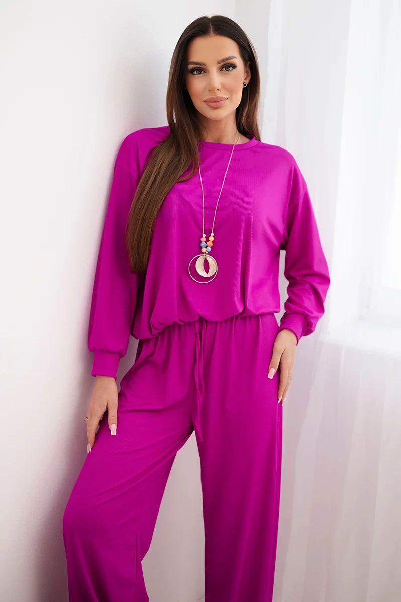 Komplet damski wiskozowy bluza z wisiorkiem i szerokie spodnie ciemno fioletowy Stylowy i wygodny komplet damski stworzony z myślą o kobiecie, która ceni sobie modę i komfort. Luźna bluza z długim rękawem, zakończona elastycznym ściągaczem, subtelnie podkreśla talię, a jednocześnie zapewnia swobodę ruchów. Szerokie spodnie z elastyczną talią i prostą nogawką tworzą harmonijną całość, która świetnie sprawdzi się na co dzień, w podróży, a nawet jako elegancki homewear. Przyjemna w dotyku wiskoza z dodatkiem elastanu daje uczucie miękkości i dopasowania.