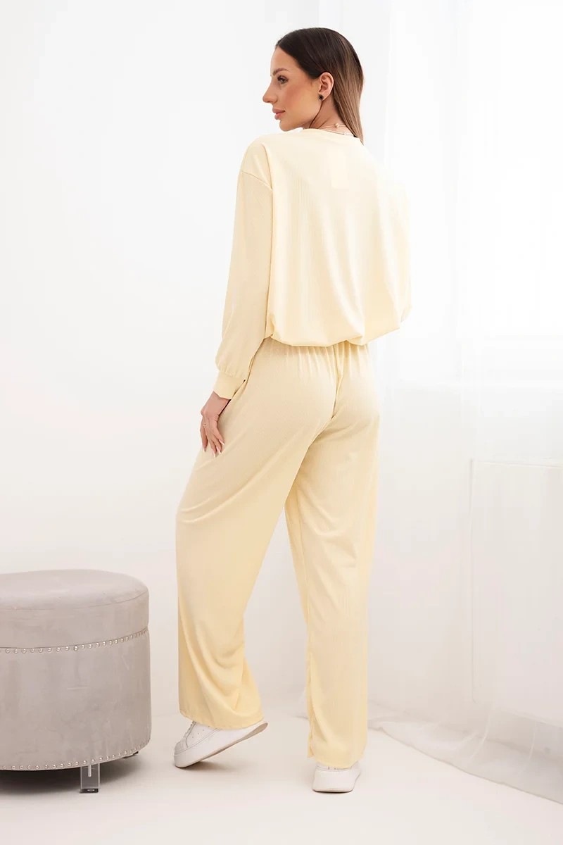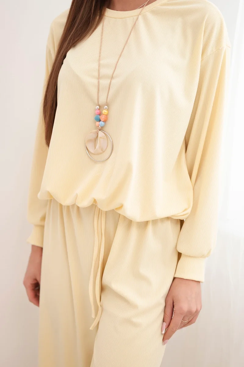 Komplet damski wiskozowy bluza z wisiorkiem i szerokie spodnie żółty Stylowy i wygodny komplet damski stworzony z myślą o kobiecie, która ceni sobie modę i komfort. Luźna bluza z długim rękawem, zakończona elastycznym ściągaczem, subtelnie podkreśla talię, a jednocześnie zapewnia swobodę ruchów. Szerokie spodnie z elastyczną talią i prostą nogawką tworzą harmonijną całość, która świetnie sprawdzi się na co dzień, w podróży, a nawet jako elegancki homewear. Przyjemna w dotyku wiskoza z dodatkiem elastanu daje uczucie miękkości i dopasowania.