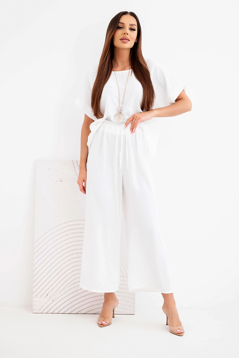 Komplet damski wiskozowy bluzka krótki rękaw i spodnie szeroka nogawka ecru Komplet damski bluzka krótki rękaw i spodnie szeroka nogawka to doskonała propozycja dla kobiet, które cenią sobie wygodę, lekkość oraz stylowy wygląd.To idealny zestaw zarówno na co dzień, jak i na spotkania czy wakacyjne wyjazdy. Minimalistyczny design pozwala na łatwe dopasowanie dodatków i tworzenie wielu stylizacji. Komplet można nosić razem lub osobno, co czyni go bardzo praktycznym elementem garderoby. Produkcja Włoska to gwarancja wysokiej jakości wykonania oraz dbałości o detale.