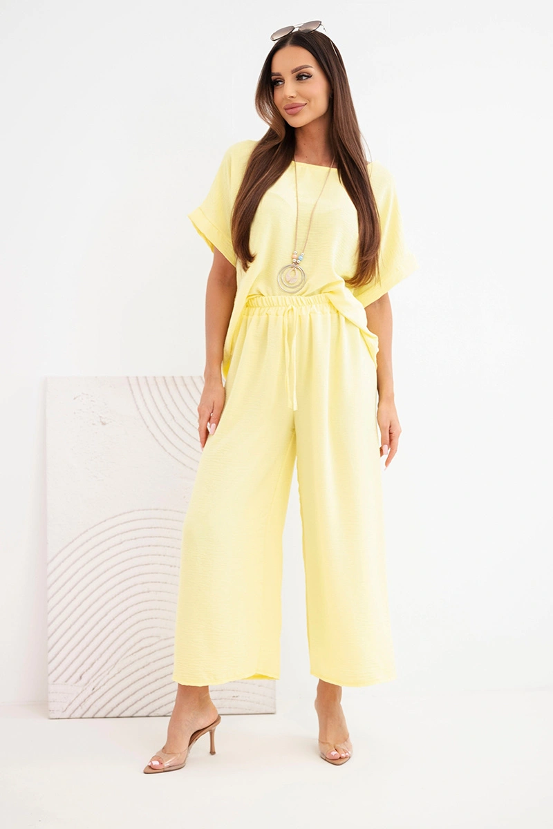Komplet damski wiskozowy bluzka krótki rękaw i spodnie szeroka nogawka żółty Komplet damski bluzka krótki rękaw i spodnie szeroka nogawka to doskonała propozycja dla kobiet, które cenią sobie wygodę, lekkość oraz stylowy wygląd. To idealny zestaw zarówno na co dzień, jak i na spotkania czy wakacyjne wyjazdy. Minimalistyczny design pozwala na łatwe dopasowanie dodatków i tworzenie wielu stylizacji. Komplet można nosić razem lub osobno, co czyni go bardzo praktycznym elementem garderoby. Produkcja Włoska to gwarancja wysokiej jakości wykonania oraz dbałości o detale.