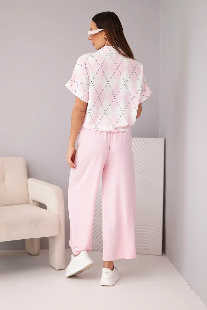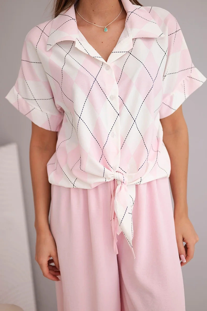 Komplet damski wiskozowy koszula z wiązaniem i spodnie z gumką pudrowy róż Postaw na urok i wygodę dzięki temu modnemu kompletowi damskiemu! Krótka koszula z kołnierzykiem i efektownym wiązaniem z przodu przyciąga uwagę delikatnym wzorem w romby, który dodaje całości subtelnej elegancji. Szerokie spodnie z gumką w pasie wykonane z lekkiego, zwiewnego materiału zapewniają komfort noszenia i swobodę ruchów przez cały dzień. Ten zestaw idealnie sprawdzi się na co dzień, na spotkania z przyjaciółmi czy letnie spacery. Można go nosić razem lub osobno, tworząc wiele kobiecych stylizacji.