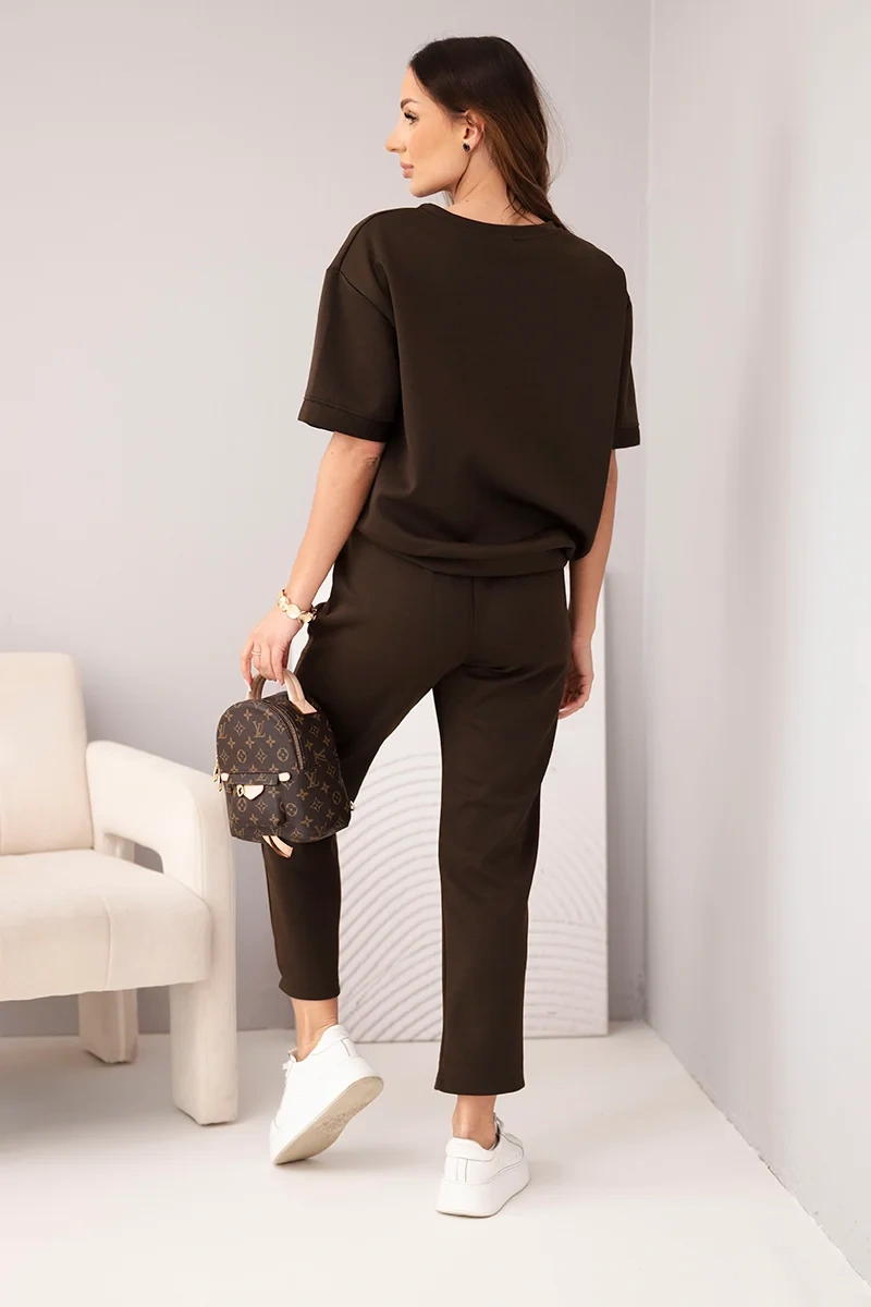 Komplet damski wiskozowy masełko z krótkim rękawem i spodniami z podwijaną nogawką brązowy Stylowy komplet damski to doskonała propozycja dla kobiet, które cenią wygodę oraz modny, minimalistyczny styl. Zestaw składa się z luźnej bluzki z krótkim rękawem oraz komfortowych spodni z elastycznym pasem. To idealny komplet damski na co dzień – sprawdzi się zarówno podczas spaceru, zakupów, jak i w domowym zaciszu.