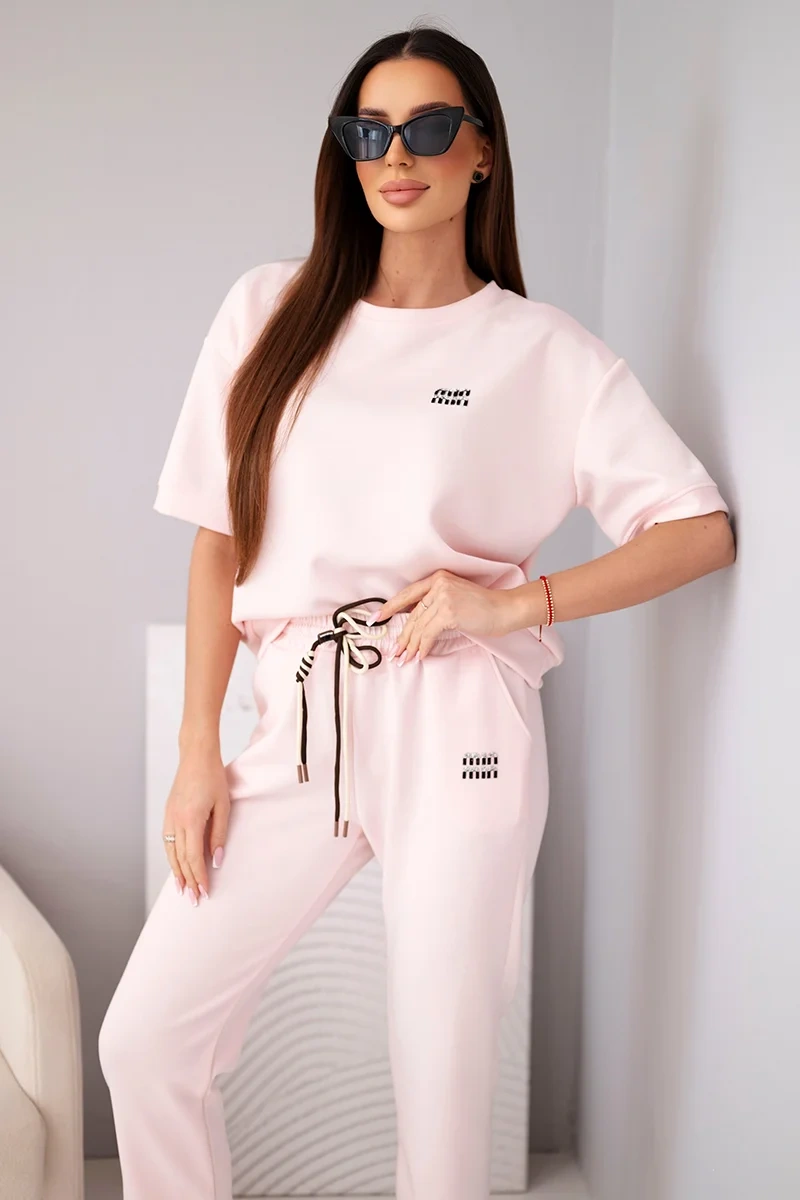Bluzka damska o swobodnym kroju zapewnia pełną wygodę noszenia i nie krępuje ruchów. Klasyczny, okrągły dekolt oraz delikatny, subtelny nadruk z przodu nadają jej nowoczesnego charakteru. Spodnie damskie posiadają elastyczną gumkę w pasie oraz troczek do regulacji, dzięki czemu można idealnie dopasować je do sylwetki. Dodatkowym atutem są praktyczne kieszenie oraz podwijane nogawki, które podkreślają casualowy styl zestawu.