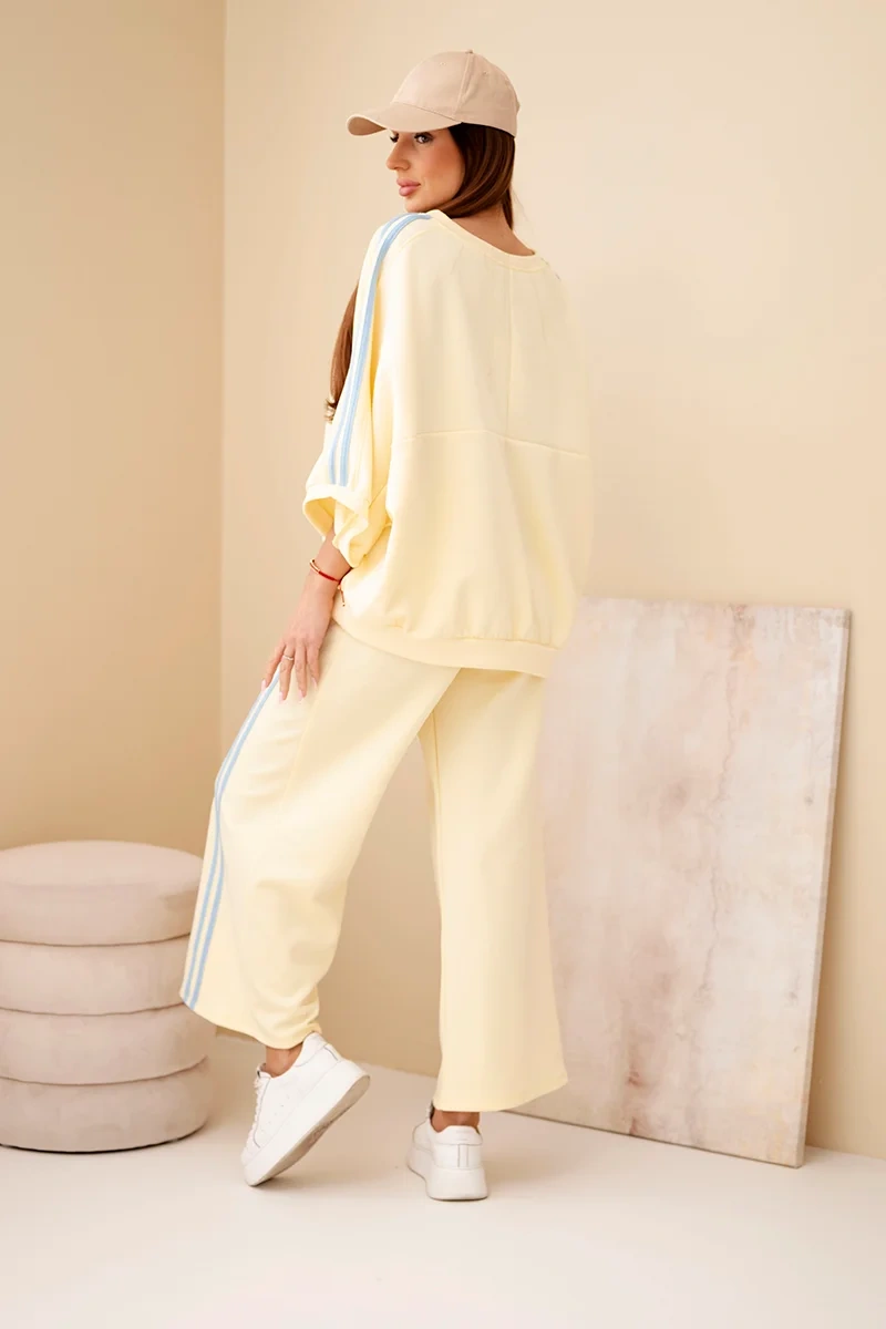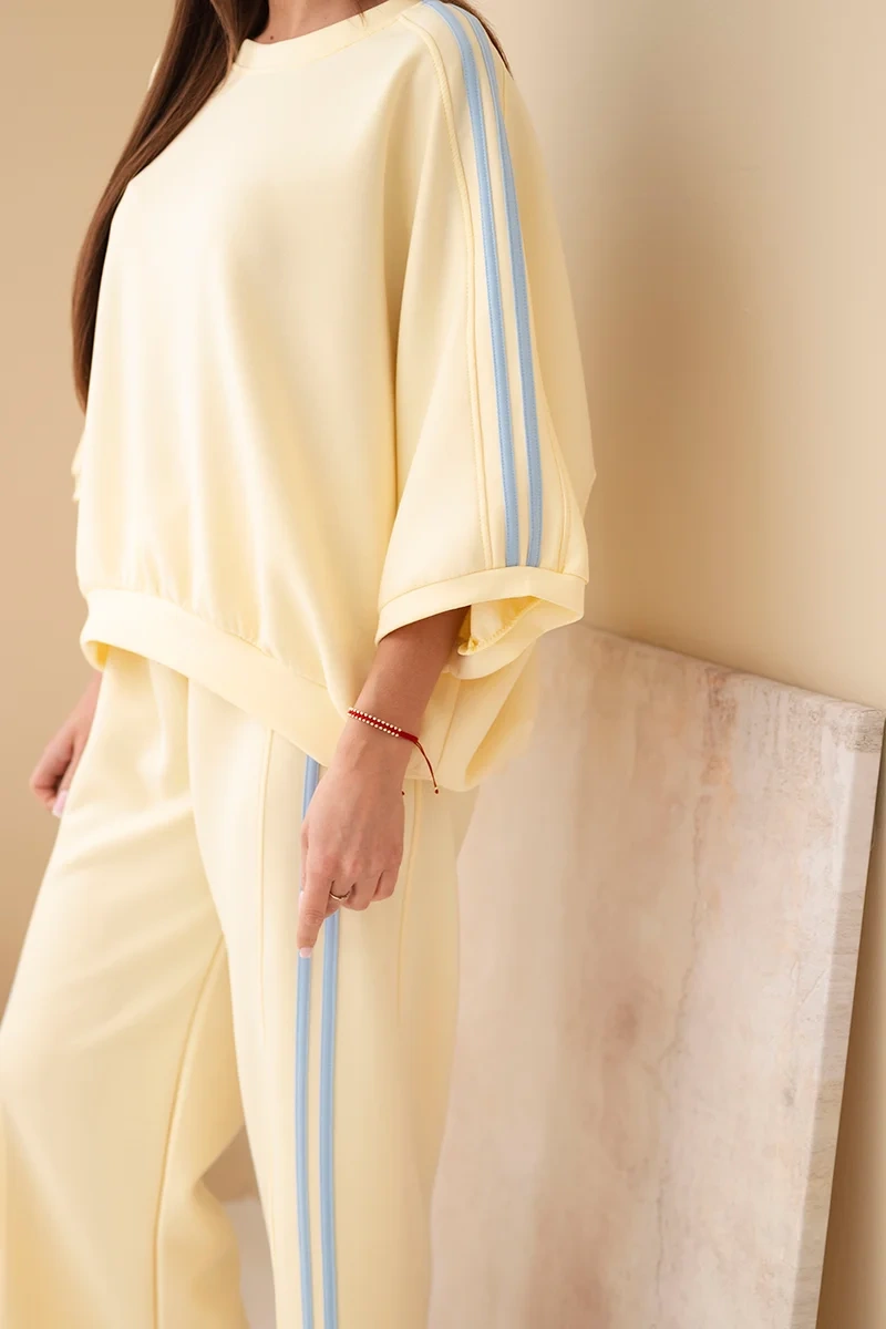 Komplet damski wiskozowy masełko z szeroką nogawką i luźną bluzą żółty Stylowy komplet damski dresowy to idealna propozycja dla kobiet, które cenią wygodę, modny wygląd i swobodę ruchów. Zestaw składa się z luźnej bluzy o oversize’owym kroju oraz spodni z szeroką nogawką, które pięknie układają się na sylwetce i nadają całości nowoczesnego charakteru. To doskonały wybór zarówno na co dzień, jak i na wyjazd, spacer czy relaks w domowym zaciszu.