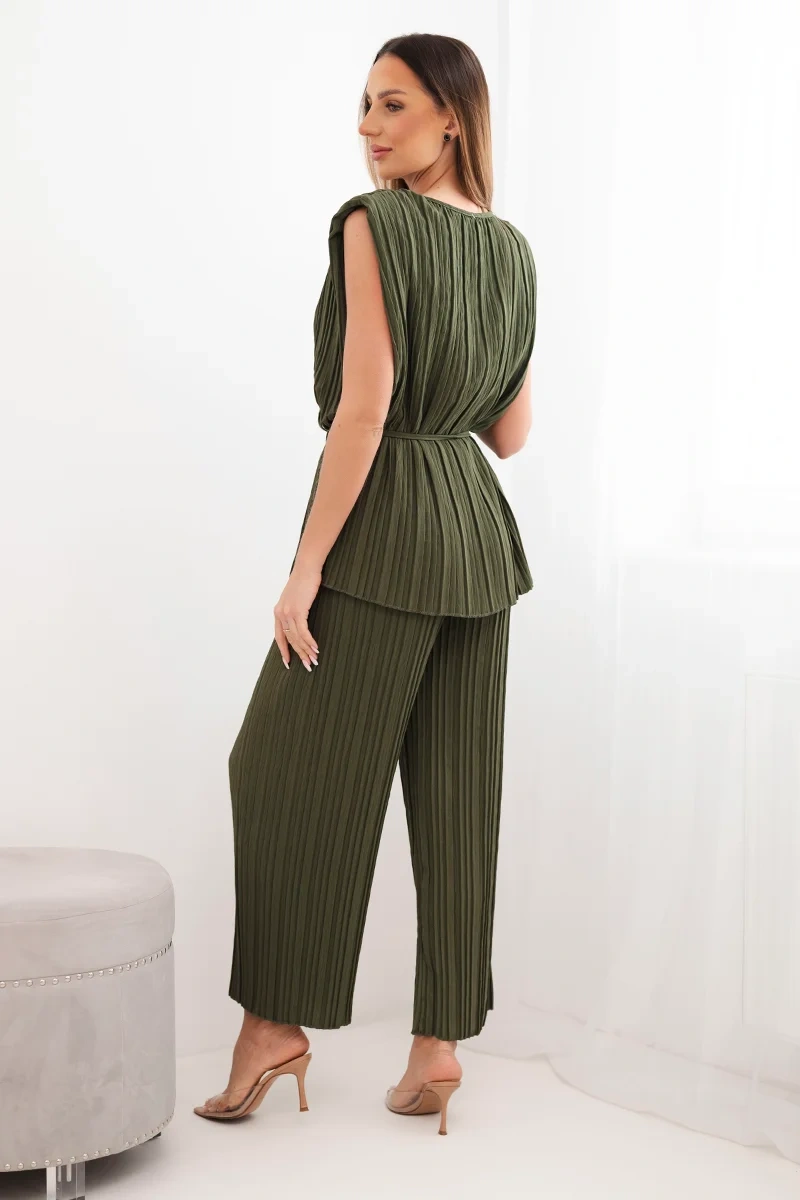Komplet damski wiskozowy plisowany z wiązaną bluzką i szerokimi spodniami khaki