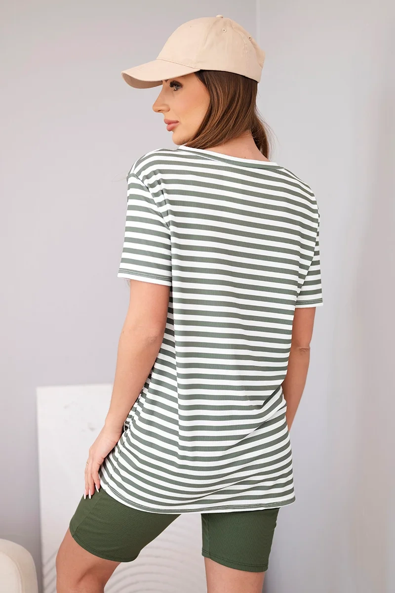 Komplet damski wiskozowy w paski z krótkim rękawem i spodenkami khaki Komplet damski w paski z krótkim rękawem i spodenkami to wygodna i stylowa propozycja na cieplejsze dni. Zestaw składa się z luźniejszej bluzki z krótkim rękawem oraz dopasowanych spodenek, dzięki czemu całość prezentuje się modnie i bardzo kobieco. To idealny wybór na co dzień, spacer, wakacyjny wyjazd, a także do noszenia po domu w komfortowym wydaniu. Połączenie klasycznego wzoru pasków z gładkimi spodenkami sprawia, że komplet wygląda nowocześnie i uniwersalnie.
