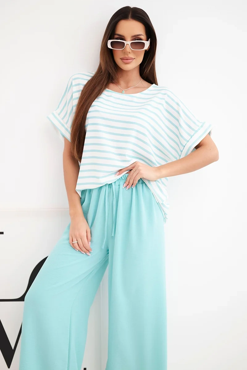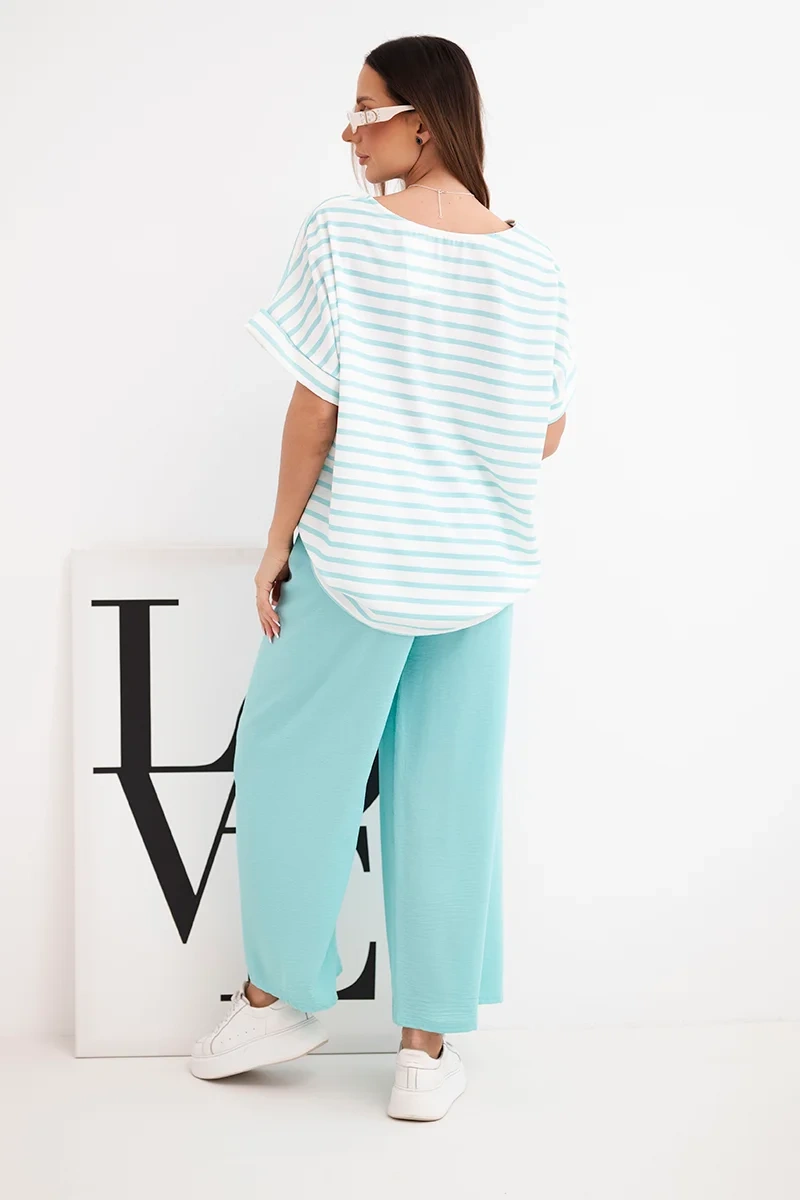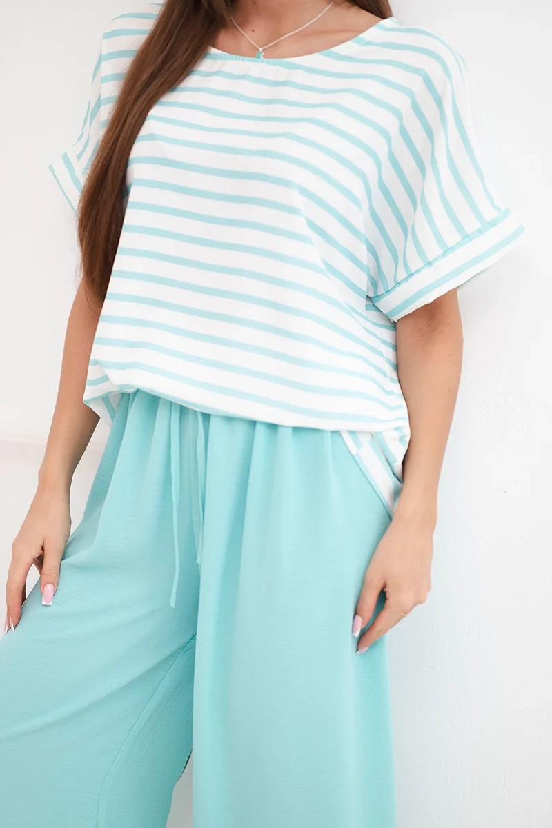 Komplet damski wiskozowy z bluzką w paski i szerokiemi spodniami z gumką miętowy Wprowadź do swojej garderoby powiew świeżości dzięki temu stylowemu kompletowi damskiemu! Bluzka z krótkim rękawem w subtelne paski oraz szerokie, lejące spodnie to idealne połączenie komfortu i modnego wyglądu. Komplet świetnie sprawdzi się zarówno na spacer, do pracy, jak i na wakacyjny wyjazd. Zwiewna, lekka tkanina doskonale układa się na sylwetce, zapewniając swobodę ruchów przez cały dzień. Elastyczna talia w spodniach gwarantuje wygodę i dopasowanie do figury.