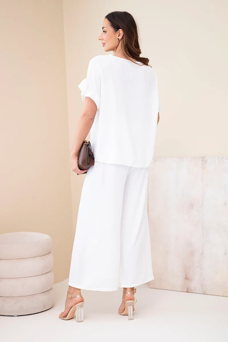Komplet damski wiskozowy z bluzką z nadrukiem i spodniami biały Stylowy komplet damski to doskonała propozycja dla kobiet ceniących wygodę oraz modny wygląd. Zestaw składa się z luźnej bluzki z krótkim rękawem oraz szerokich spodni o komfortowym kroju. Bluzka wyróżnia się efektownym nadrukiem z motywem kwiatowym oraz asymetrycznym dołem, który nadaje całości nowoczesnego i oryginalnego charakteru.