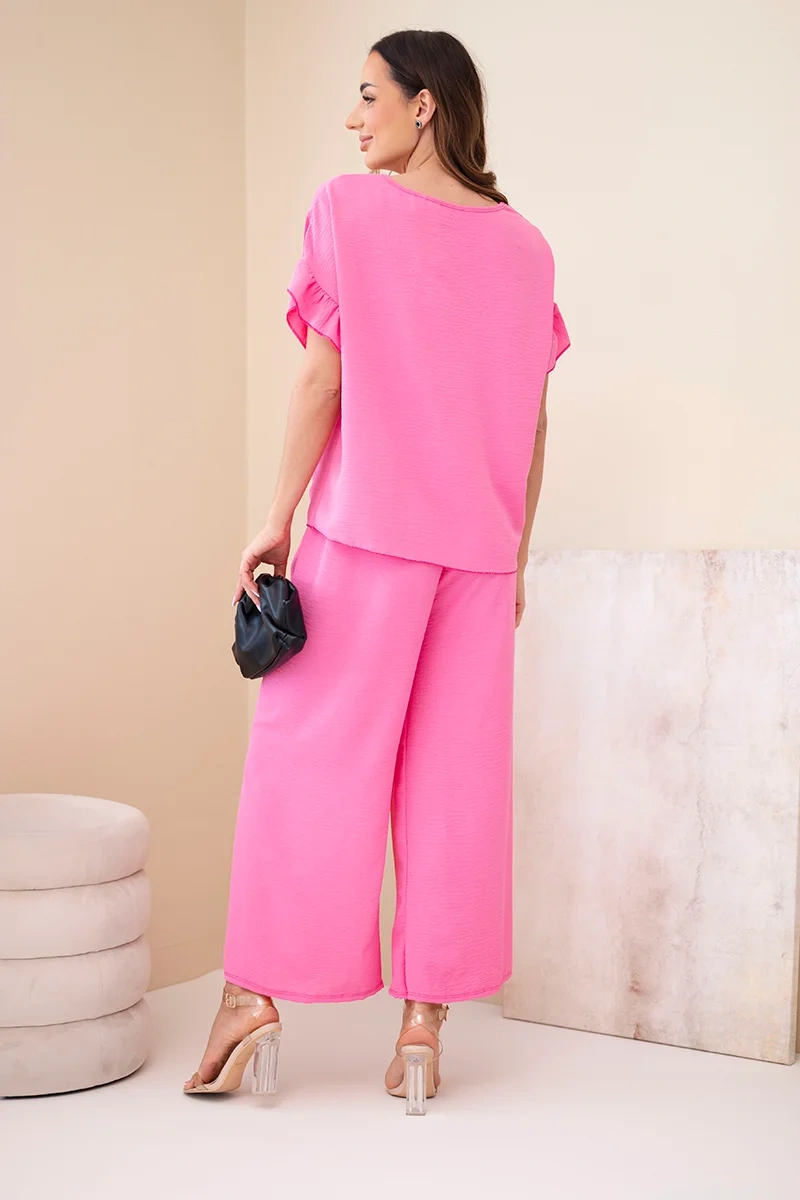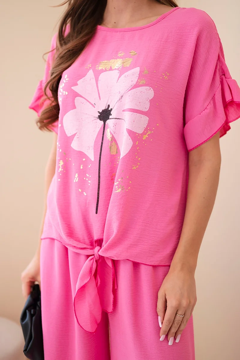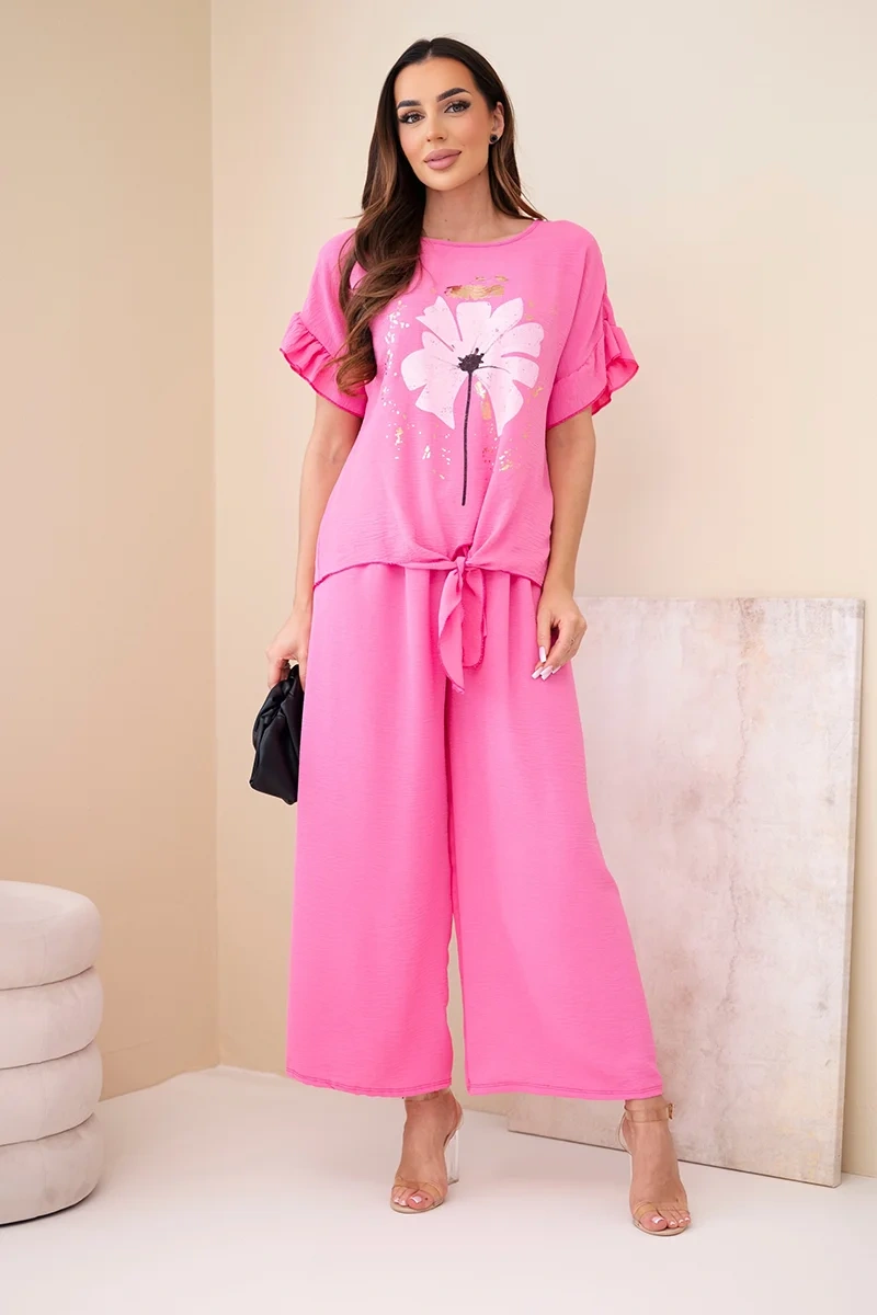 Komplet damski wiskozowy z bluzką z nadrukiem i spodniami jasny różowy