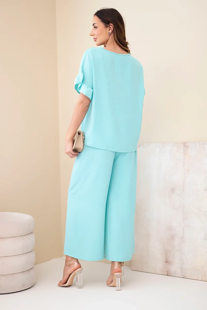 Szerokie spodnie z elastyczną gumką w pasie oraz regulacją w postaci sznurka zapewniają wygodne dopasowanie do sylwetki. Lekki, przyjemny w dotyku materiał sprawia, że komplet idealnie sprawdzi się w codziennych stylizacjach, podczas spacerów, spotkań czy wakacyjnych wyjazdów. Produkcja Włoska gwarantuje wysoką jakość wykonania oraz dbałość o detale.