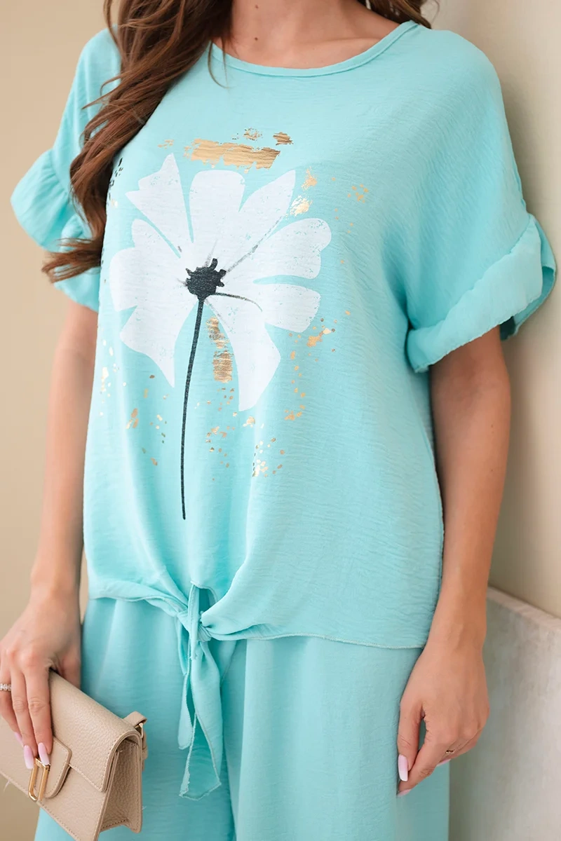 Stylowy komplet damski to doskonała propozycja dla kobiet ceniących wygodę oraz modny wygląd. Zestaw składa się z luźnej bluzki z krótkim rękawem oraz szerokich spodni o komfortowym kroju. Bluzka wyróżnia się efektownym nadrukiem z motywem kwiatowym oraz asymetrycznym dołem, który nadaje całości nowoczesnego i oryginalnego charakteru.