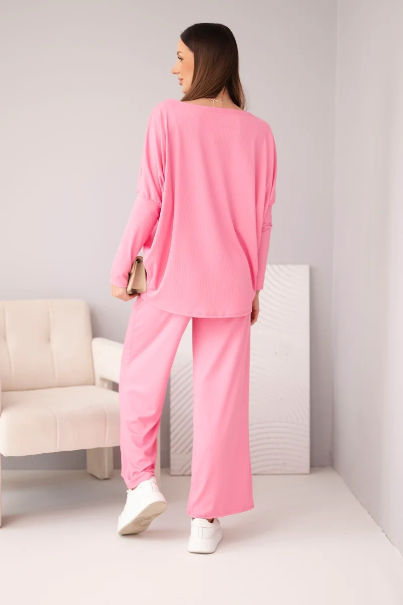 Komplet damski wiskozowy z luźną bluzką i spodniami jasno różowy Ten komplet damski to doskonała propozycja dla kobiet ceniących sobie komfort, prostotę i styl. Luźna bluzka z opadającym rękawem i delikatnie wydłużonym tyłem świetnie współgra z szerokimi, swobodnymi spodniami na elastycznym pasie. Całość tworzy wygodny, przewiewny i jednocześnie bardzo stylowy zestaw na co dzień.