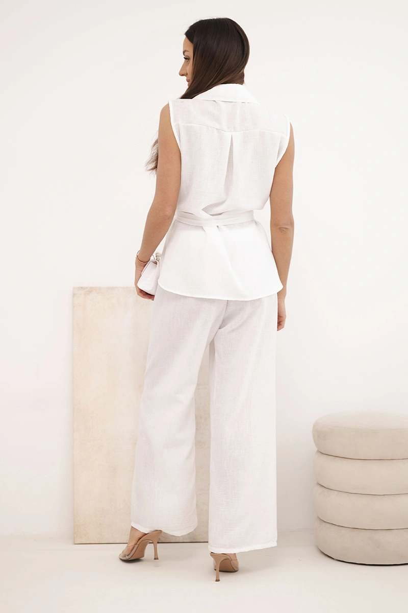 Komplet damski z wiązaną bluzką i szerokimi spodniami ecru Stylowy komplet damski to doskonała propozycja dla kobiet, które cenią wygodę, modny wygląd i uniwersalne rozwiązania w codziennych stylizacjach. Model składa się z bluzki bez rękawów zapinanej na guziki oraz długich spodni o szerokiej nogawce, dzięki czemu całość prezentuje się lekko, kobieco i bardzo nowocześnie. Dodatkowym atutem bluzki jest klasyczny kołnierzyk, kieszonki na piersi oraz pasek do wiązania w talii, który pięknie podkreśla sylwetkę. Spodnie posiadają wygodną gumkę w pasie, co zapewnia komfort noszenia i dobre dopasowanie do figury.