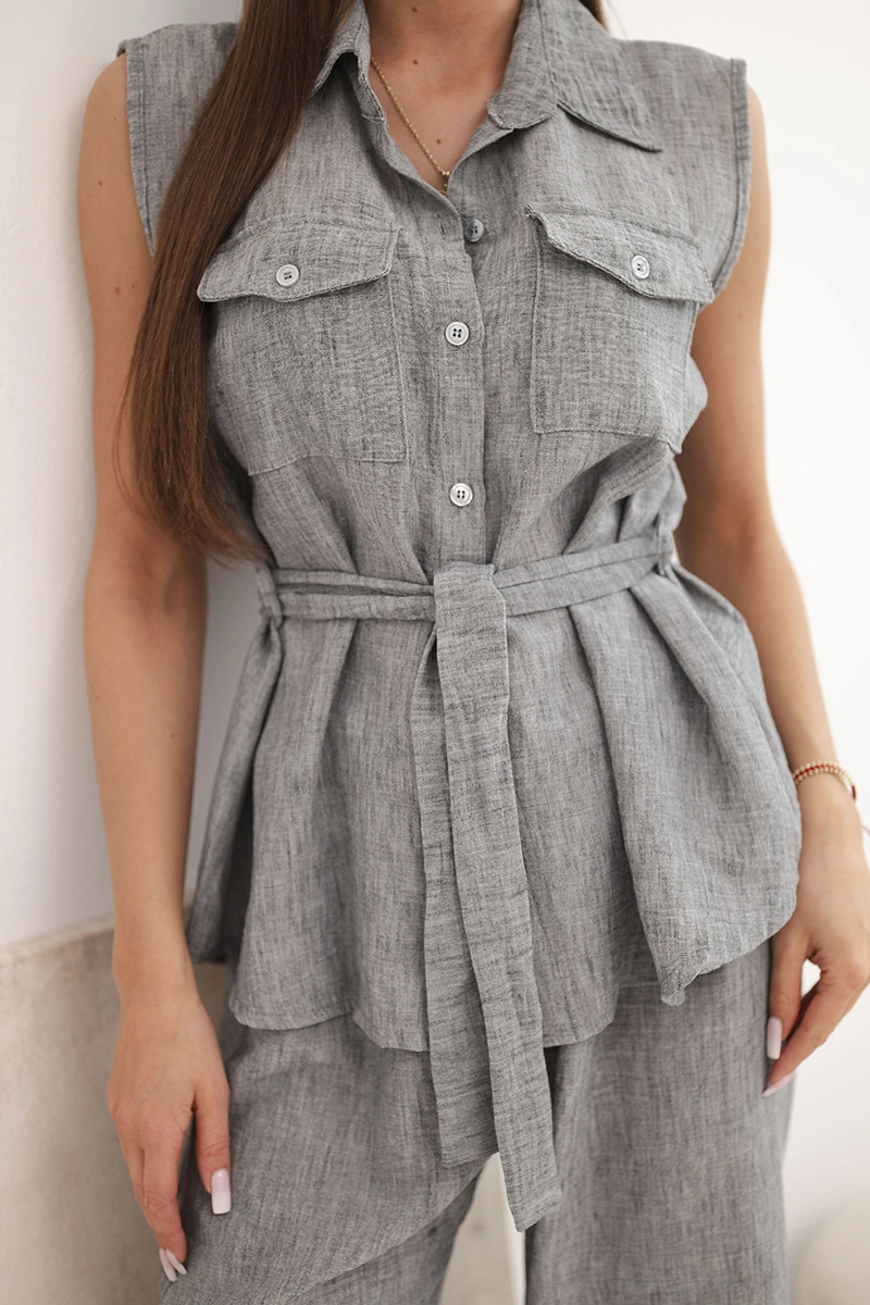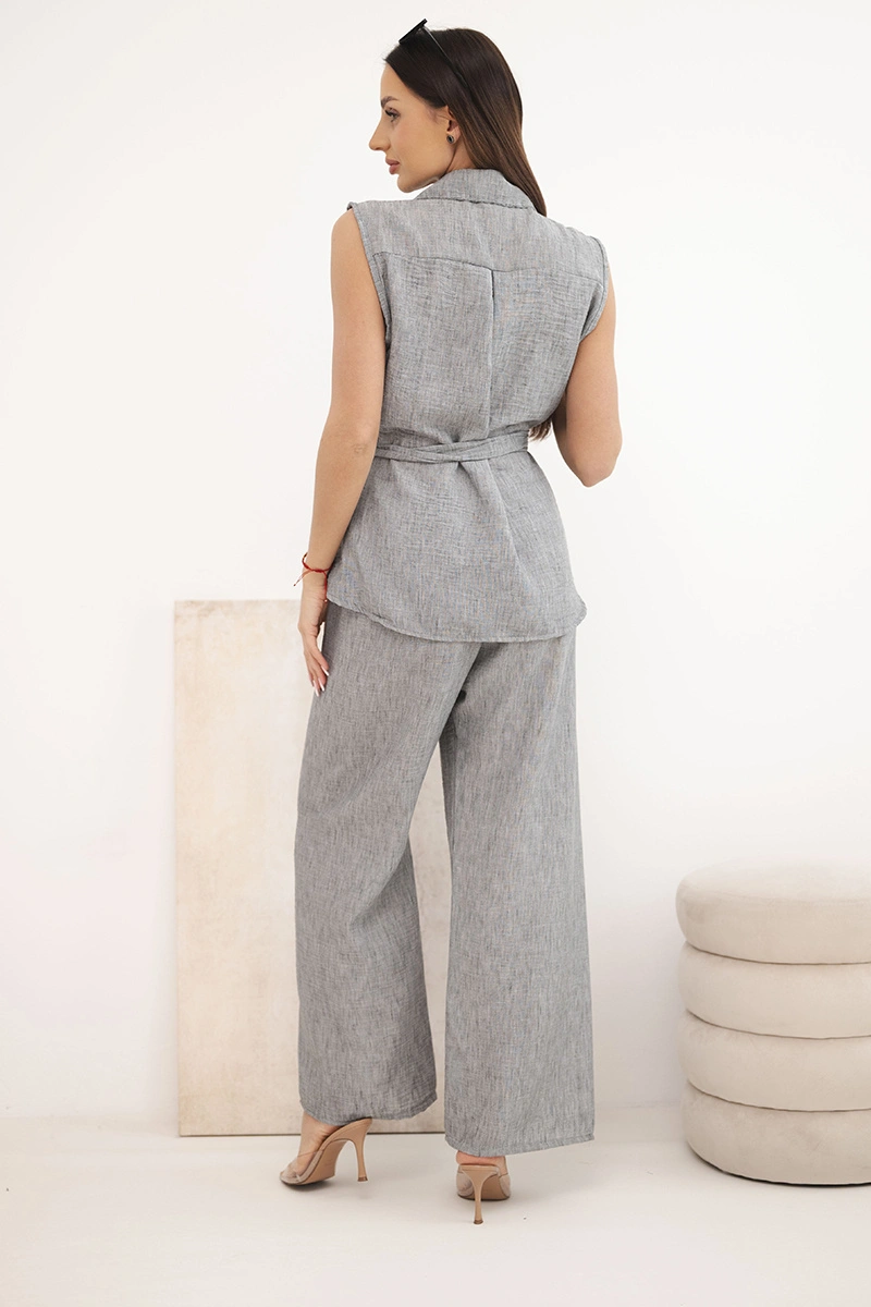 Komplet damski z wiązaną bluzką i szerokimi spodniami grafitowy Stylowy komplet damski to doskonała propozycja dla kobiet, które cenią wygodę, modny wygląd i uniwersalne rozwiązania w codziennych stylizacjach. Model składa się z bluzki bez rękawów zapinanej na guziki oraz długich spodni o szerokiej nogawce, dzięki czemu całość prezentuje się lekko, kobieco i bardzo nowocześnie. Dodatkowym atutem bluzki jest klasyczny kołnierzyk, kieszonki na piersi oraz pasek do wiązania w talii, który pięknie podkreśla sylwetkę. Spodnie posiadają wygodną gumkę w pasie, co zapewnia komfort noszenia i dobre dopasowanie do figury.