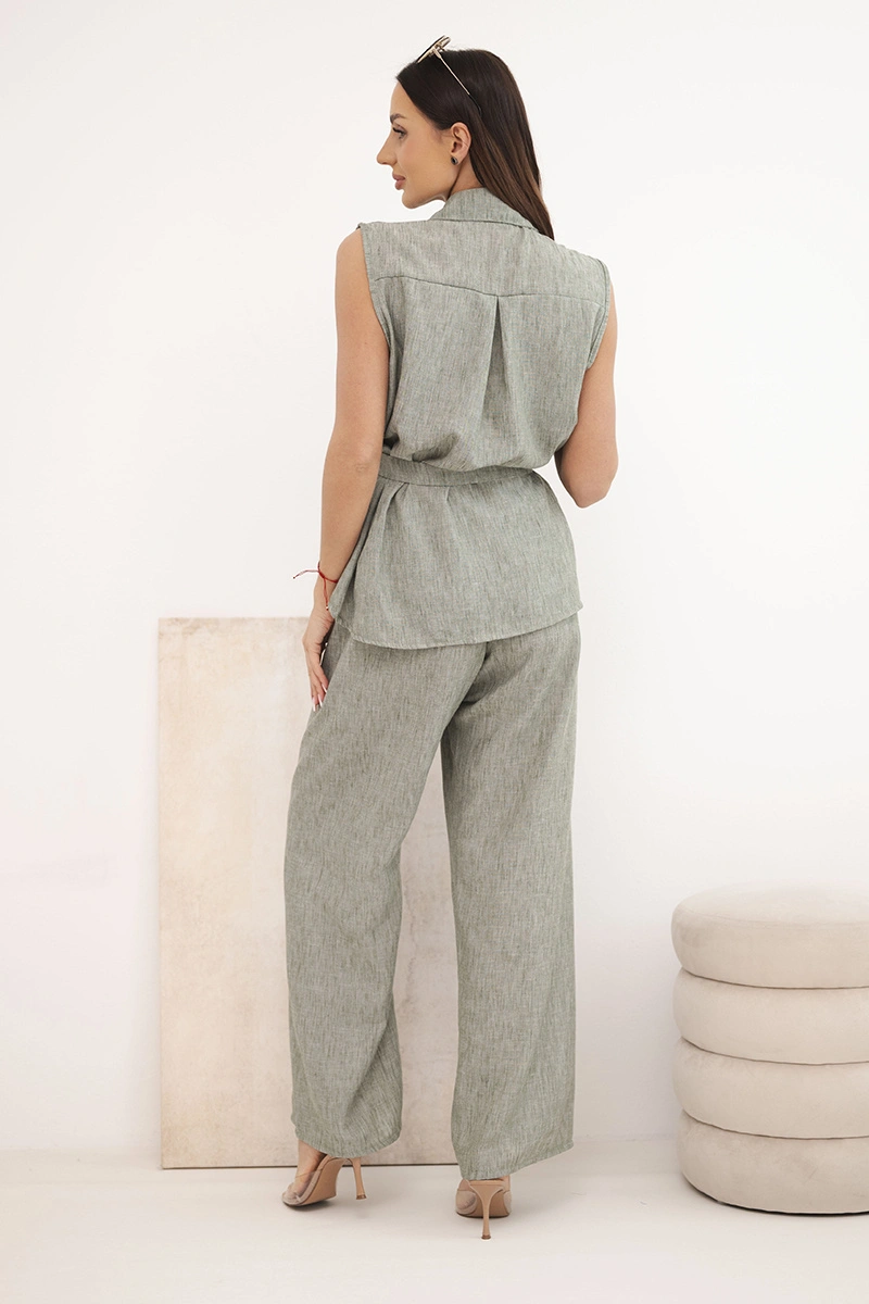 Komplet damski z wiązaną bluzką i szerokimi spodniami khaki Stylowy komplet damski to doskonała propozycja dla kobiet, które cenią wygodę, modny wygląd i uniwersalne rozwiązania w codziennych stylizacjach. Model składa się z bluzki bez rękawów zapinanej na guziki oraz długich spodni o szerokiej nogawce, dzięki czemu całość prezentuje się lekko, kobieco i bardzo nowocześnie. Dodatkowym atutem bluzki jest klasyczny kołnierzyk, kieszonki na piersi oraz pasek do wiązania w talii, który pięknie podkreśla sylwetkę. Spodnie posiadają wygodną gumkę w pasie, co zapewnia komfort noszenia i dobre dopasowanie do figury.