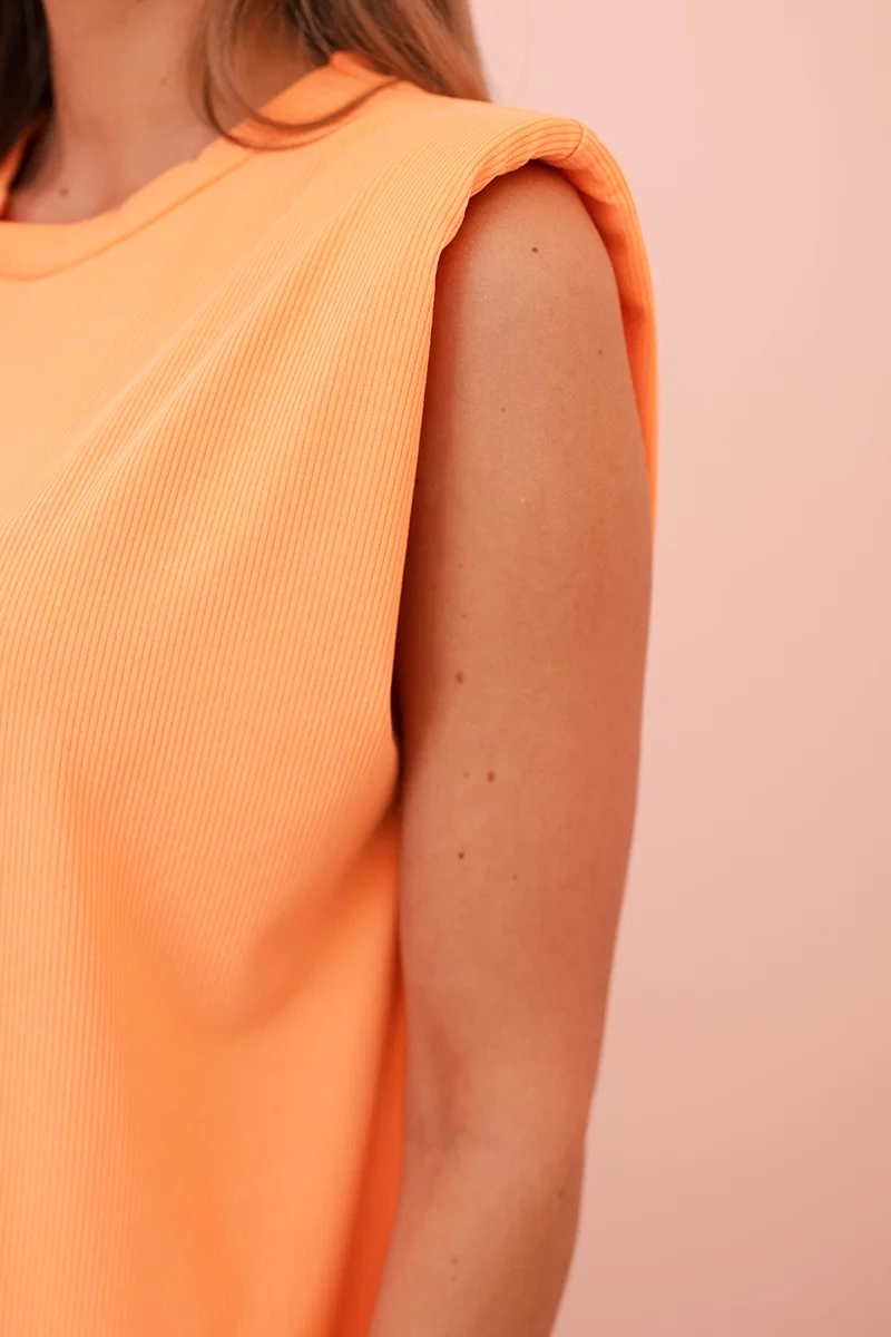 Komplet damski z wiskozy bez rękawów i prostymi spodniami pomaranczowy Wygodny komplet damski wykonany z miękkiej i elastycznej dzianiny wiskozowej to świetna propozycja na co dzień, do domu lub na spacer. Bluzka bez rękawów o klasycznym kroju zapewnia swobodę ruchów, a długie spodnie z prostą nogawką i elastycznym pasem doskonale dopasowują się do sylwetki. Gładki, jednolity materiał wygląda schludnie i nowocześnie, tworząc bazę do wielu stylizacji – możesz nosić komplet razem lub osobno.