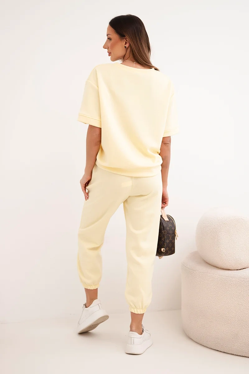 Komplet damski z wiskozy masełko z krótkim rękawem i spodniami żółty Szukasz wygodnego, a zarazem stylowego zestawu na co dzień? Komplet dresowy damski z krótkim rękawem i elastycznymi spodniami to idealny wybór na każdą porę roku. Dzięki uniwersalnemu krojowi i przyjemnemu w dotyku materiałowi, zestaw świetnie sprawdzi się zarówno w domowym zaciszu, jak i podczas aktywności na świeżym powietrzu. Produkcja Włoska zapewnia wysoką jakość wykonania i modny wygląd. Rozmiar jest uniwersalny i będzie odpowiedni dla Pań w rozmiarze S, M lub L.