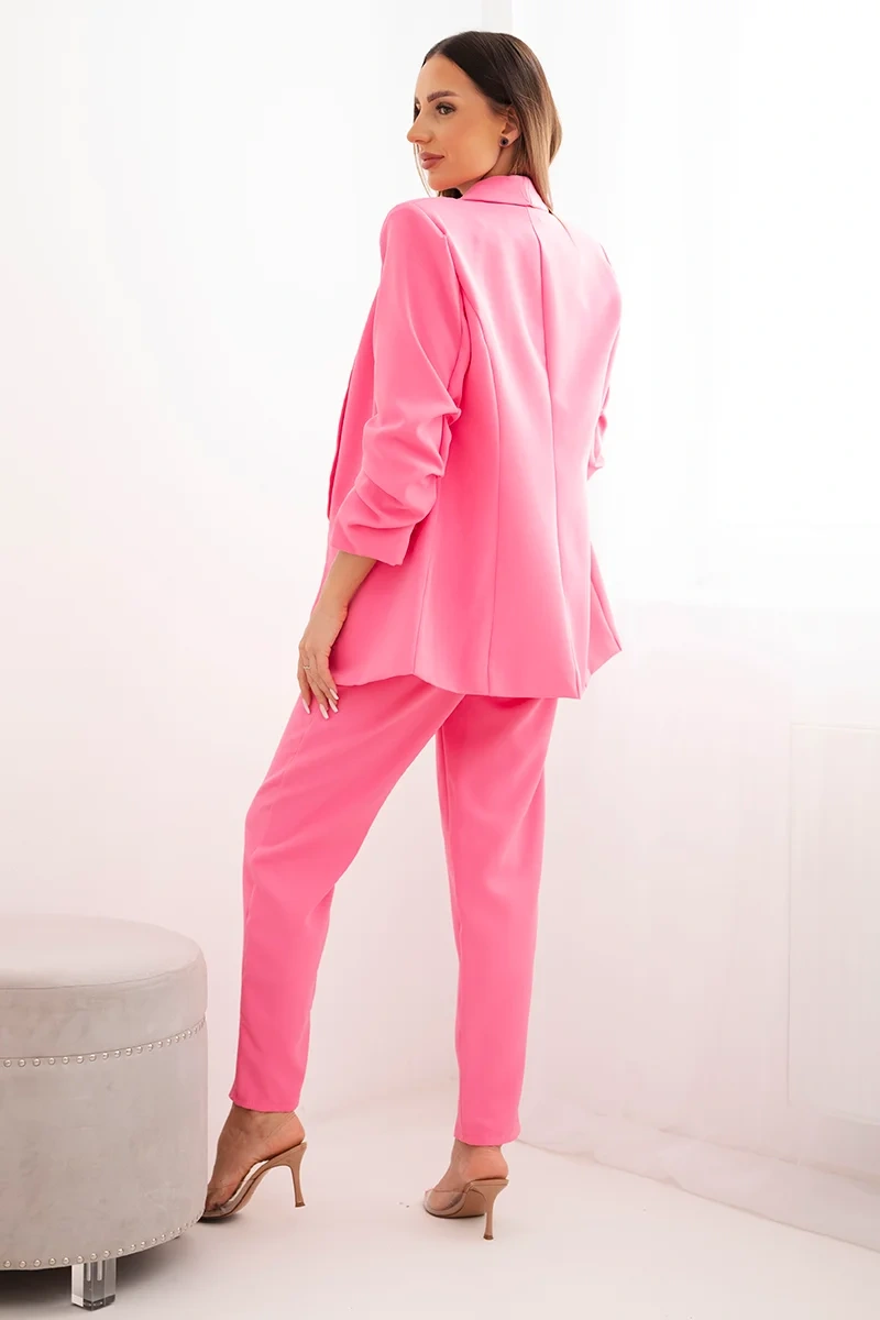 Komplet elegancki marynarki ze spodniami jasny różowy Prezentujemy Państwu elegancki komplet marynarki i spodni. Marynarka bez zapięcia z klapami z przodu. Marynarka posiada podszewkę. Spodnie z kieszeniami oraz paskiem. W pasie spodni z tyłu wszyta elastyczna taśma. Bardzo modny i stylowy komplet. Komplet wykonany jest z wysokiej jakości materiału. Rozmiar jest uniwersalny i będzie odpowiedni dla Pań w rozmiarze S, M lub L.