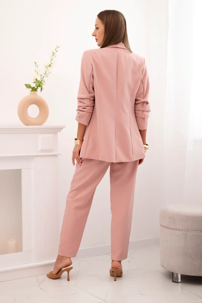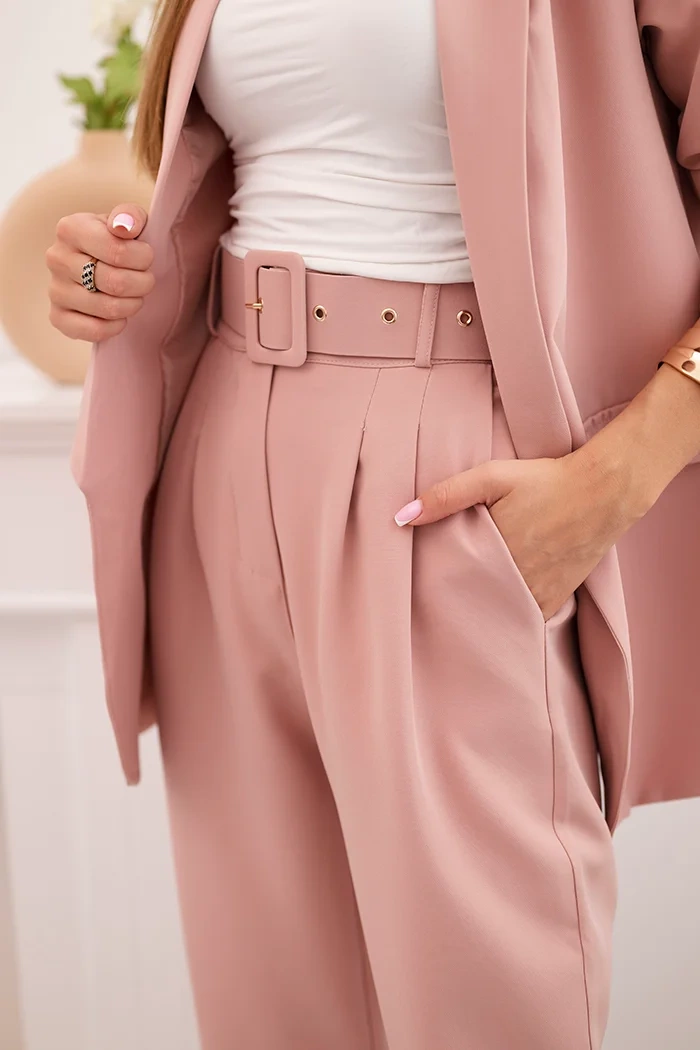 Prezentujemy Państwu elegancki komplet marynarki i spodni. Marynarka bez zapięcia z klapami z przodu. Marynarka posiada podszewkę. Spodnie z kieszeniami oraz paskiem. W pasie spodni z tyłu wszyta elastyczna taśma. Bardzo modny i stylowy komplet. Komplet wykonany jest z wysokiej jakości materiału. Rozmiar jest uniwersalny i będzie odpowiedni dla Pań w rozmiarze S, M lub L.