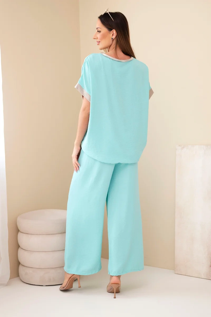 Komplet z wiskozy ze złotym obszyciem miętowy Ten wyjątkowy komplet to połączenie wygody i szykownego stylu, idealne dla kobiet ceniących subtelne, ale efektowne akcenty. Wykonany z lekkiej, przewiewnej wiskozy, gwarantuje maksymalny komfort noszenia przez cały dzień. Delikatna tkanina pięknie układa się na sylwetce, podkreślając jej naturalne atuty. Złote obszycie nadaje całości wyjątkowego, luksusowego charakteru, przyciągając wzrok i dodając stylizacji elegancji. Dzięki temu komplet świetnie sprawdzi się zarówno na co dzień, jak i na bardziej formalne okazje. Możesz nosić go z ulubionymi dodatkami, tworząc unikalne stylizacje dopasowane do Twojego stylu. Postaw na komplet z wiskozy ze złotym obszyciem i poczuj się elegancko oraz stylowo w każdej sytuacji. Rozmiar jest uniwersalny i będzie odpowiedni dla Pań w rozmiarze S, M lub L.
