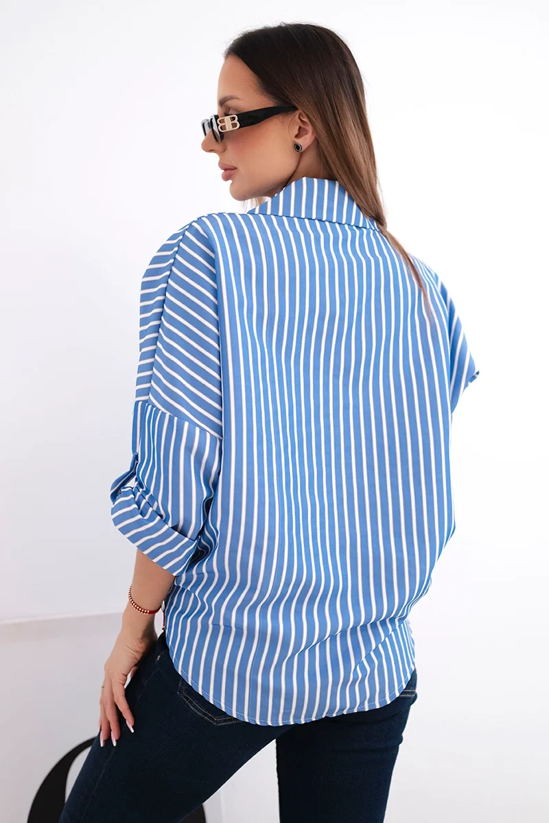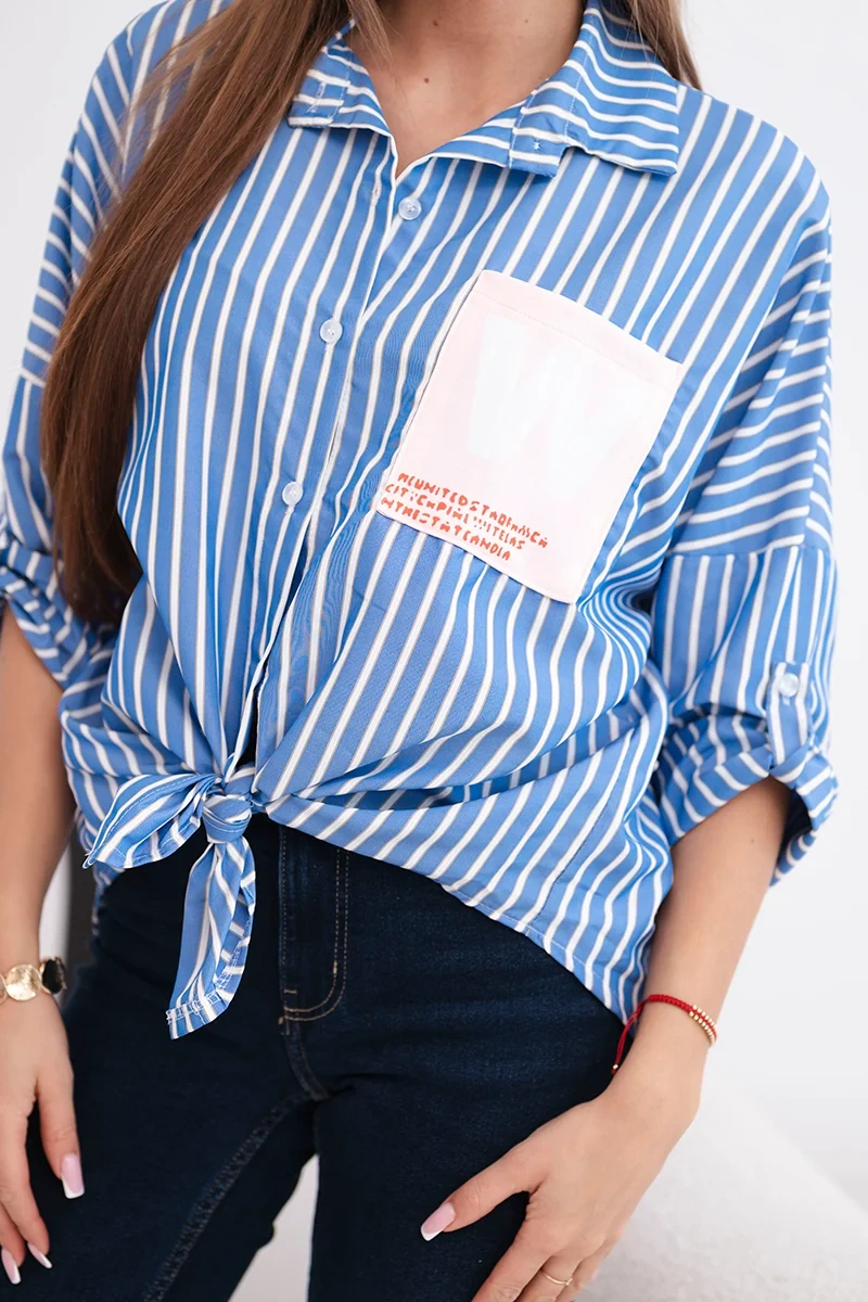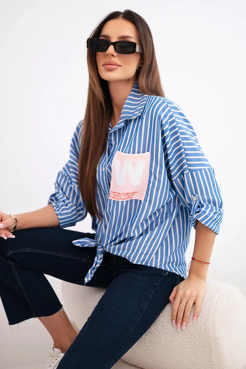 Koszula damska bawełniana w paski z wiązaniem jeansowa Koszula damska w paski z wiązaniem z przodu to doskonała propozycja dla kobiet, które cenią sobie modny wygląd i komfort noszenia. Wykonana w 100% z naturalnej bawełny, jest przewiewna, przyjemna w dotyku i idealna na cieplejsze dni. Luźniejszy krój i praktyczne detale, takie jak kieszonka na piersi oraz możliwość podwinięcia rękawów, nadają jej swobodnego, miejskiego charakteru.