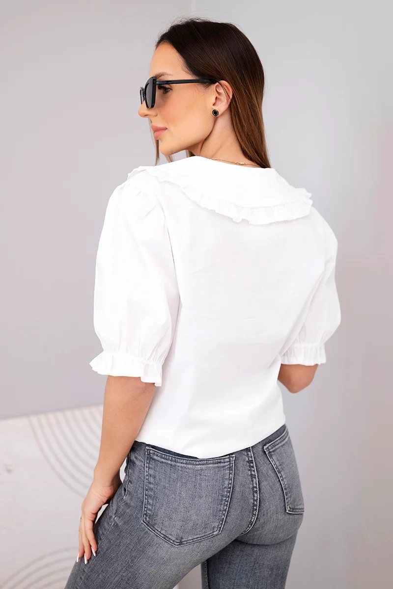 Koszula damska bawełniana z falbanką i wiązaniem biała Koszula damska bawełniana to wyjątkowa propozycja dla kobiet, które cenią sobie połączenie klasyki z modnym detalem. Model wyróżnia się efektownym kołnierzem z delikatną falbanką oraz subtelnym wiązaniem z przodu, które nadaje stylizacji lekkości i kobiecego charakteru. Krój z wydłużonym tyłem pięknie układa się na sylwetce i zapewnia komfort noszenia.