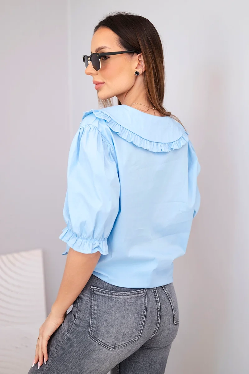 Koszula damska bawełniana z falbanką i wiązaniem niebieska Koszula damska bawełniana to wyjątkowa propozycja dla kobiet, które cenią sobie połączenie klasyki z modnym detalem. Model wyróżnia się efektownym kołnierzem z delikatną falbanką oraz subtelnym wiązaniem z przodu, które nadaje stylizacji lekkości i kobiecego charakteru. Krój z wydłużonym tyłem pięknie układa się na sylwetce i zapewnia komfort noszenia.