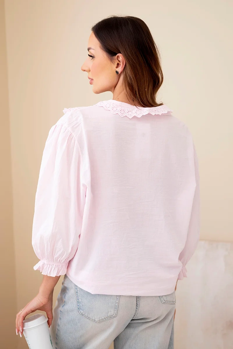 Koszula wyróżnia się efektowną koronkową wstawką w kształcie litery V oraz subtelną falbanką przy dekolcie, co nadaje jej kobiecego charakteru. Dodatkowym atutem jest wiązanie z przodu, które pozwala dopasować fason do sylwetki i stworzyć modną stylizację. Rękawy zakończone są delikatnym marszczeniem, co podkreśla lekkość całego modelu. Idealna do jeansów, spodni materiałowych lub spódnicy.