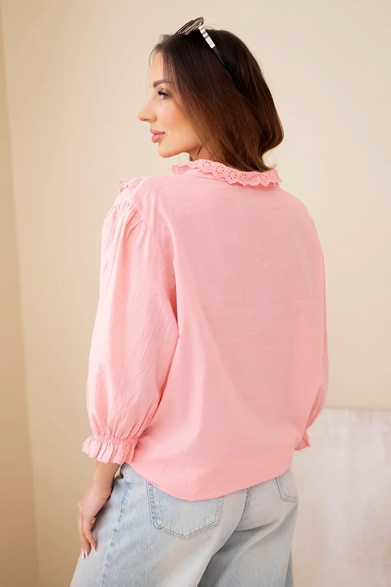 Koszula wyróżnia się efektowną koronkową wstawką w kształcie litery V oraz subtelną falbanką przy dekolcie, co nadaje jej kobiecego charakteru. Dodatkowym atutem jest wiązanie z przodu, które pozwala dopasować fason do sylwetki i stworzyć modną stylizację. Rękawy zakończone są delikatnym marszczeniem, co podkreśla lekkość całego modelu. Idealna do jeansów, spodni materiałowych lub spódnicy.